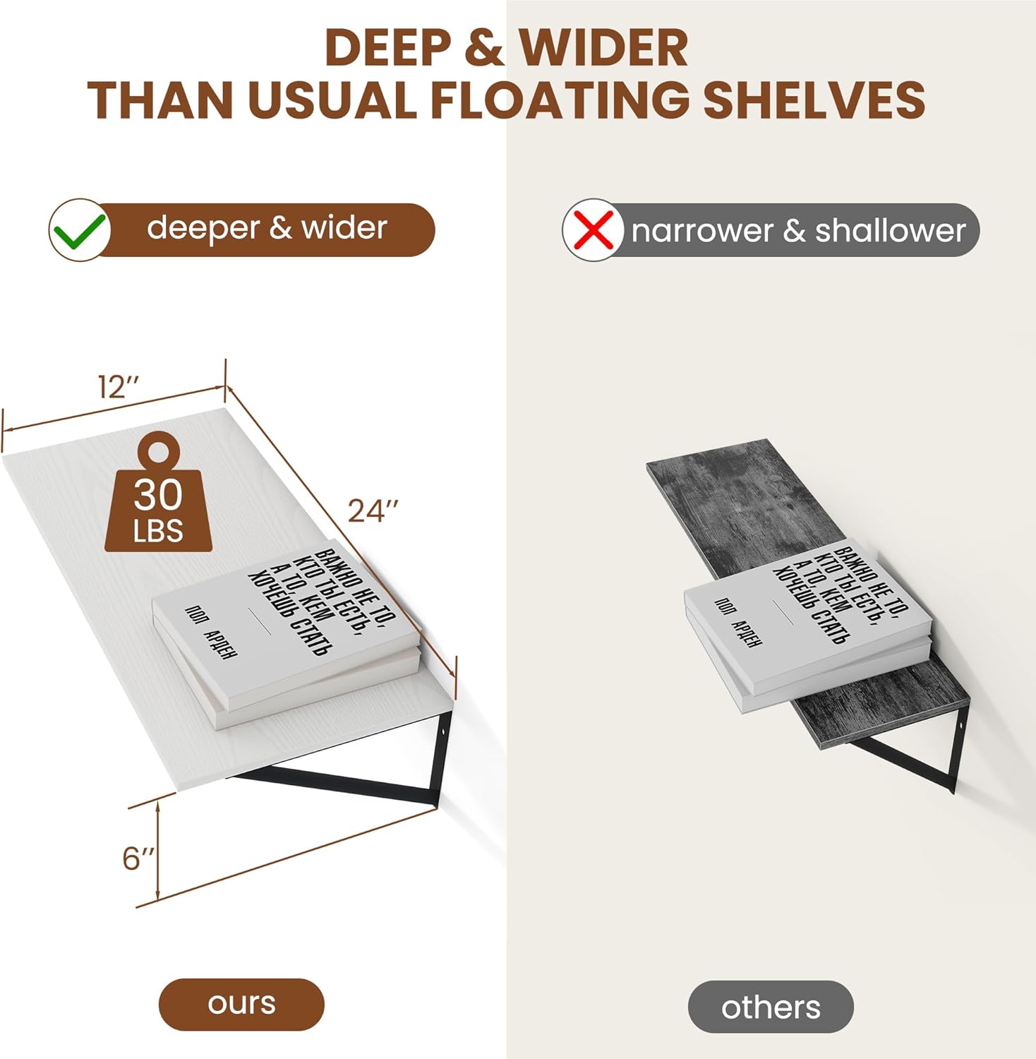 - [Size Does Matter] - These wall shelves are wider and longer than regular shelves on the market, providing more room and worry-free storage! Measures: 24Wx12Dx5.8H Easy to install within a few minutes with all necessary hardware included.