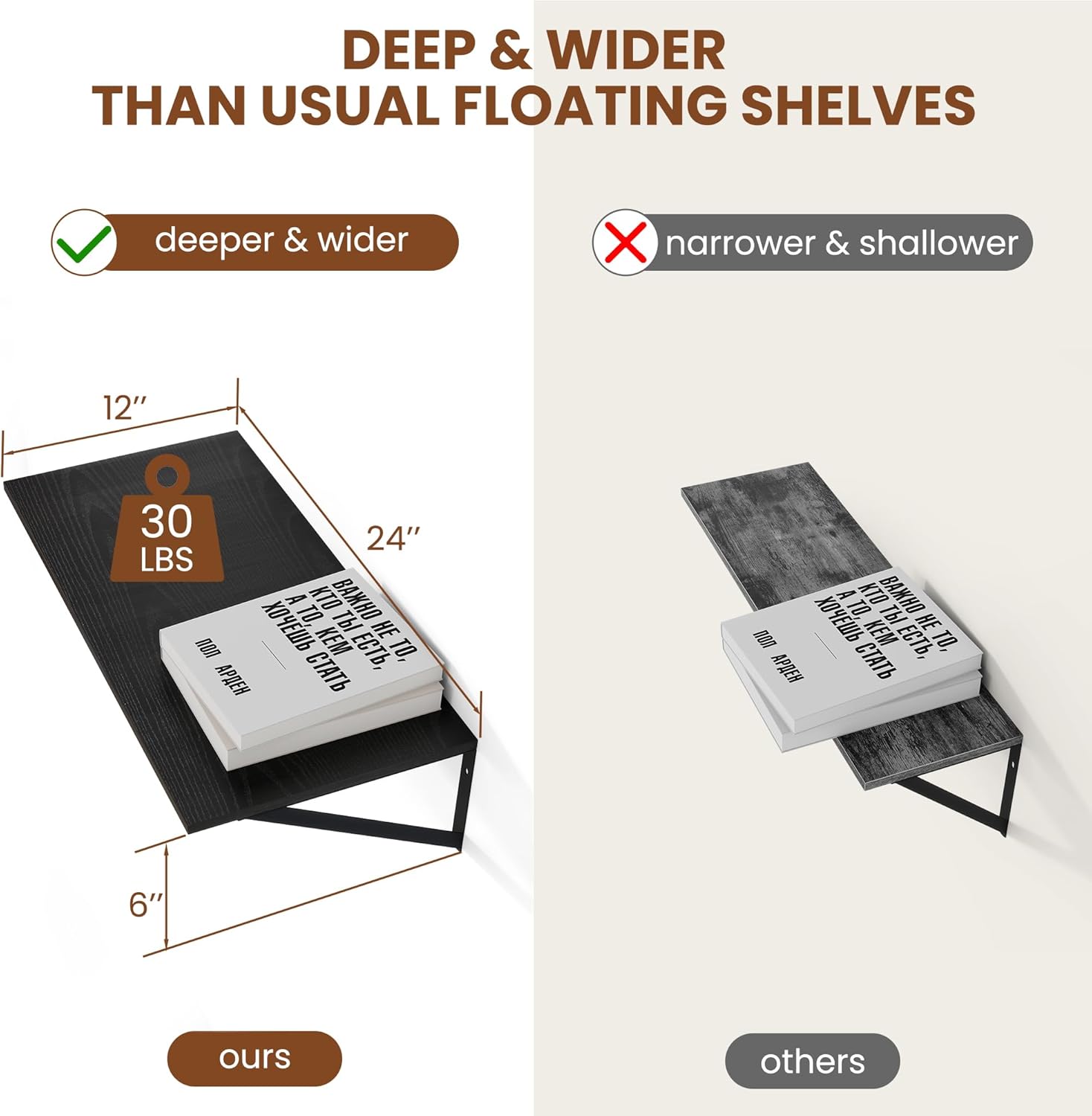 Heimlove Black Deep Floating Shelves for Wall, 24W x 12D Wood Wall Shelves Set of 2, Wide Floating Bookshelf for Living Room, Kitchen, Office, Bedroom and Decor Storage, with Metal Bracket - Black
