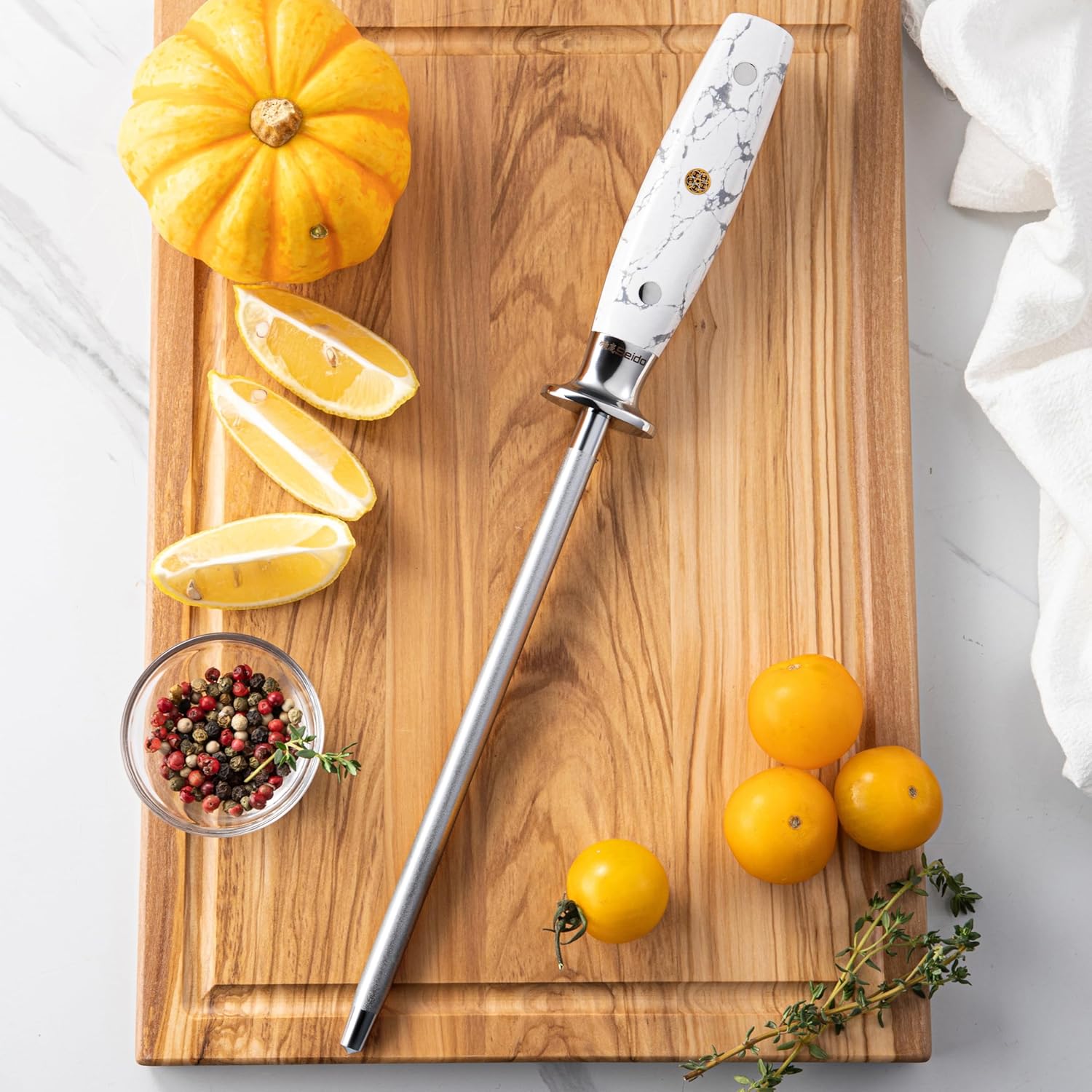 - Elegant Handle Design: Featuring a luxurious white turquoise handle with light grey marble accents, this sharpening rod combines practicality with a touch of sophistication, providing a secure and comfortable grip while enhancing your kitchen aesthetic.
