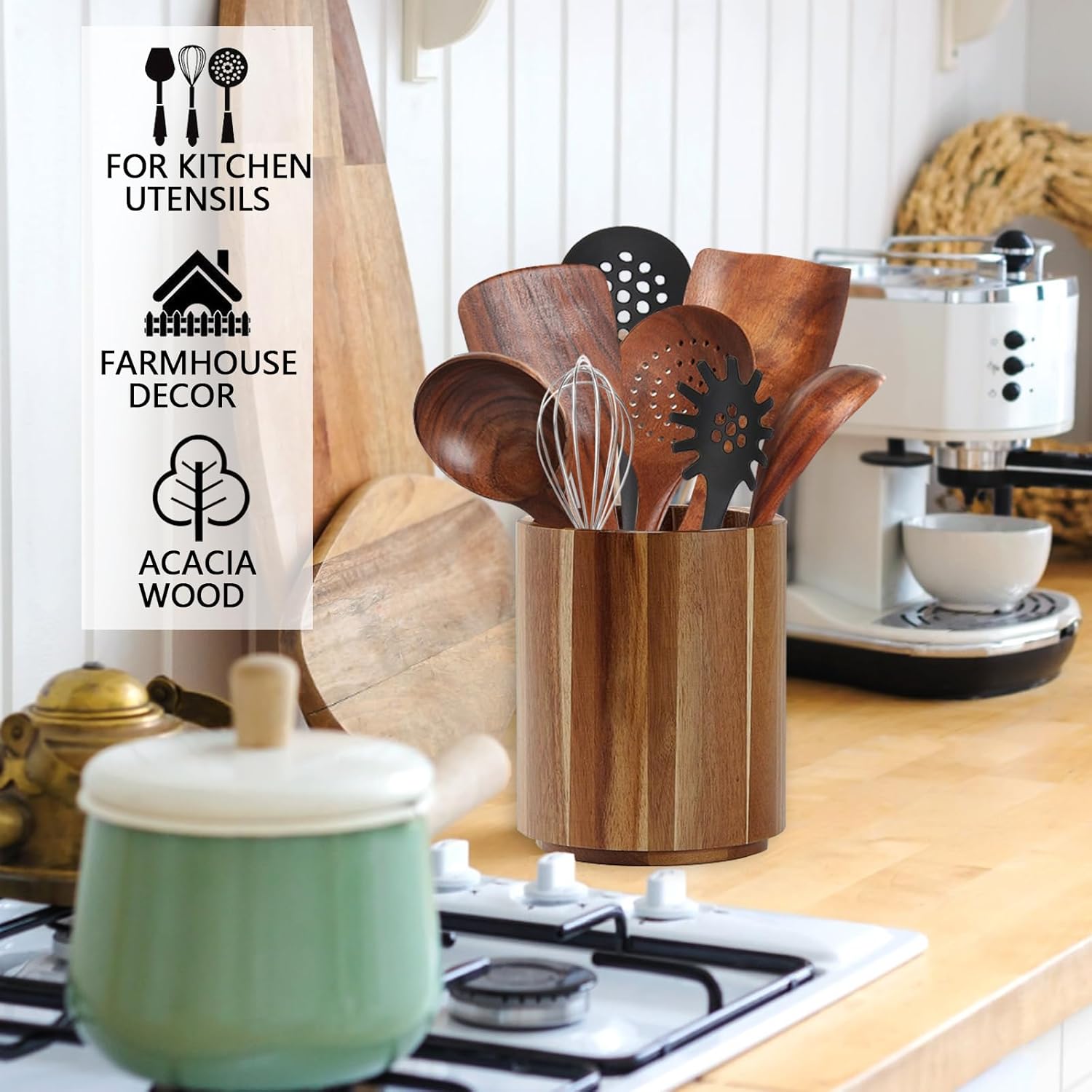 - 【Home Decoration】:The utensil crock features the original striped design of acacia wood for a clean and rustic look. This natural look will go perfectly with any kitchen décor and add a touch of sparkle to your kitchen