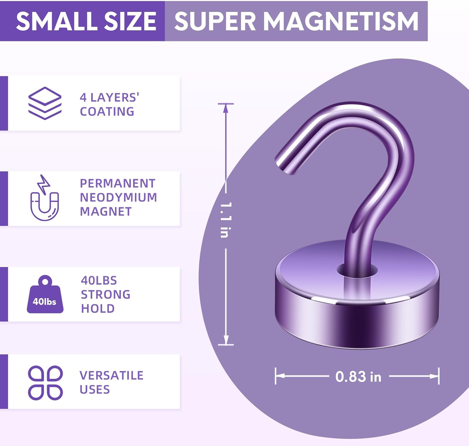 Neosmuk Magnetic Hooks, Cruise Ship Essentials, 40lb+ Heavy Duty Magnetic Hooks for Cruise Cabins, Refrigerator, Grill, Hanging, and Travel | Extra Strong Must-Haves Magnet Hook,Purple,Pack of 10