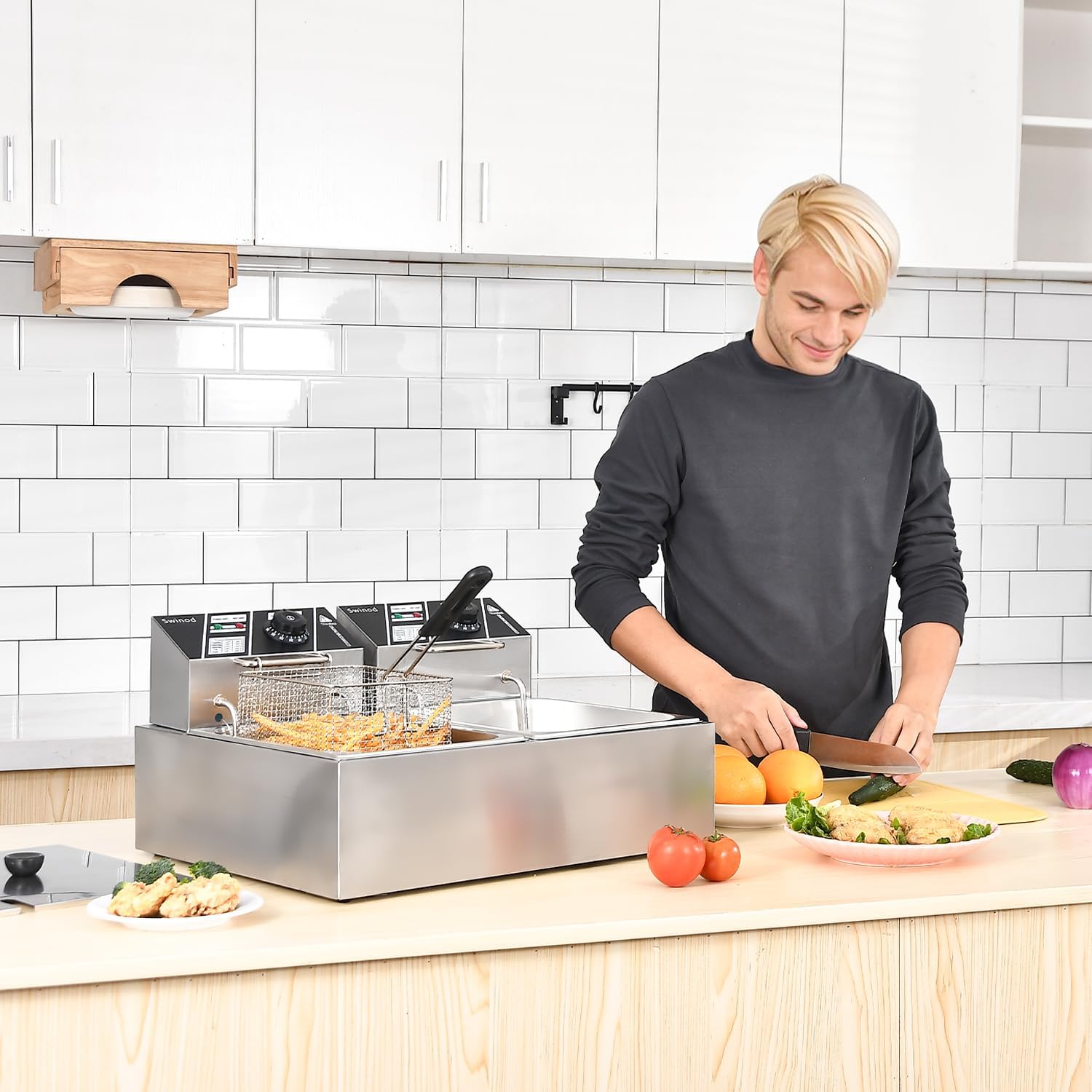Commercial Deep Fryer with Baskets, 3400W 12.7QT/12L Thickened Stainless Steel Countertop Electric Oil Fryer, Large Capacity with Temperature Control, silver