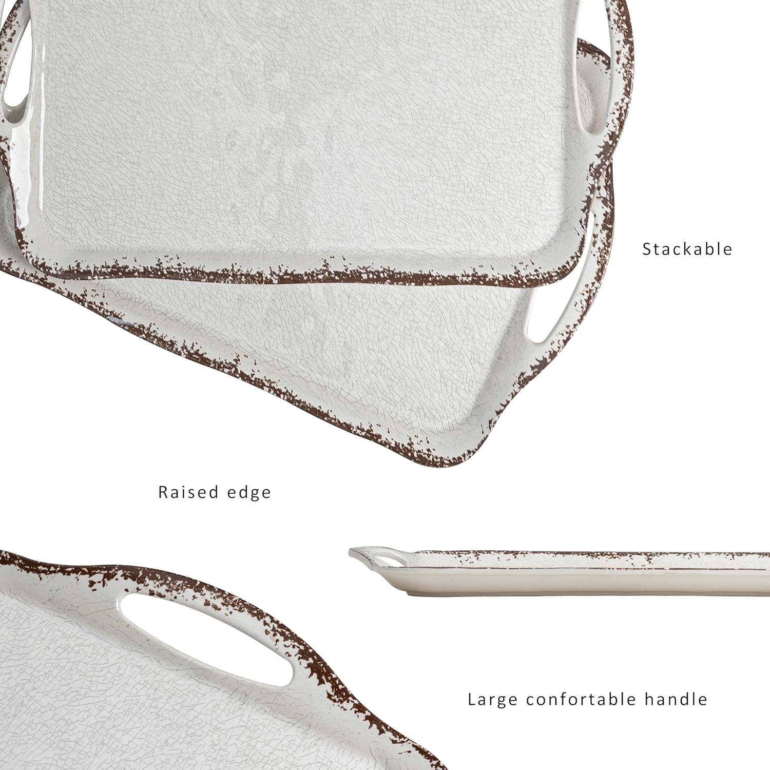 LEHAHA Vintage White Large Serving Tray with Handles, 17.25x12 inch, Set of 2 Melamine Platters for Serving Food, Turkey, Cookie, Rectangular Trays for Eating, Crackled Finish with Rustic Raised Rim.