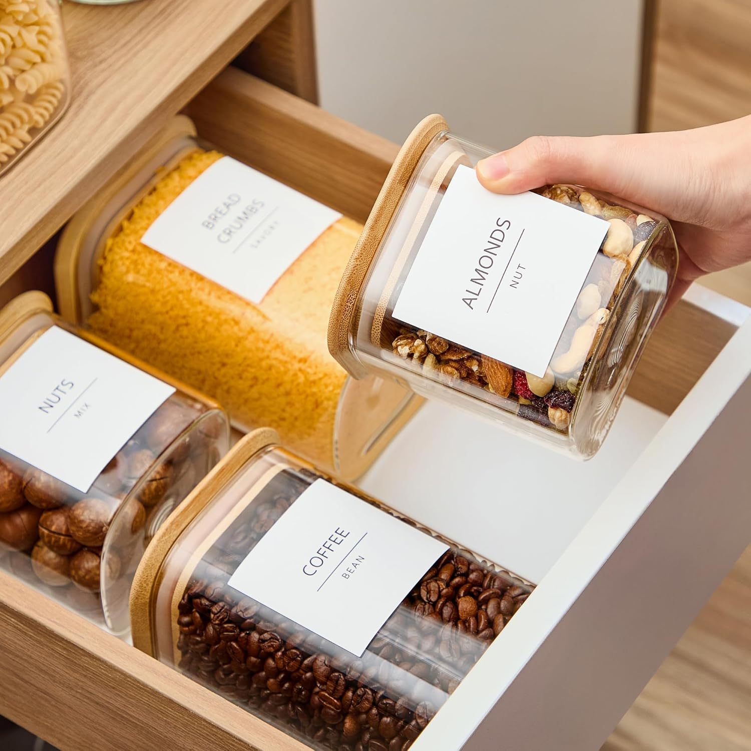 - Effortless Pantry Organization: The glass pantry storage containers with labels simplify identifying and organizing kitchen staples. Preprinted adhesive labels for common items and additional blank labels offer personalized organization options