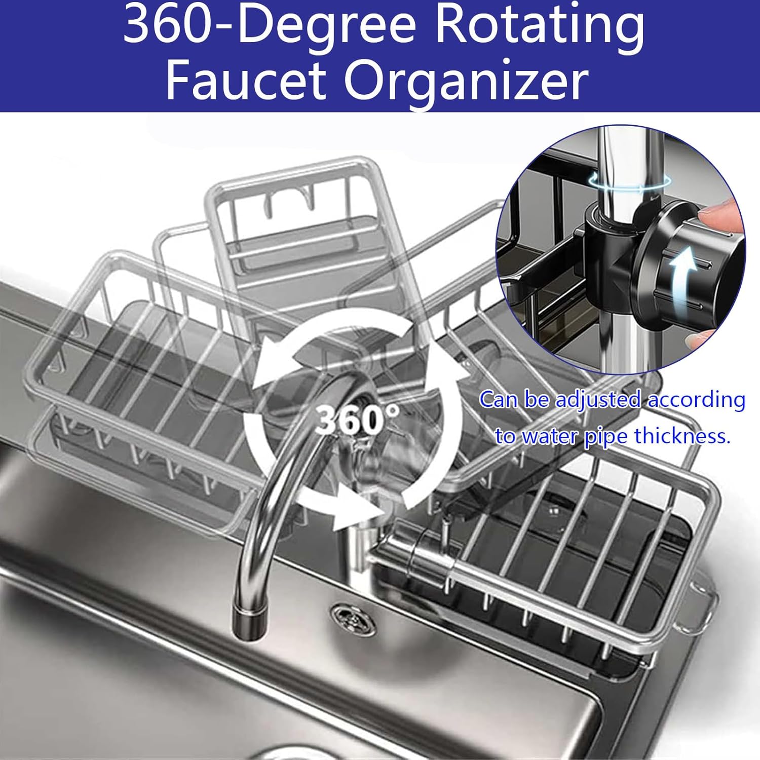 - 【Easy to Install】First snap our sink organizer on the faucet rod, then tighten the knob to fix. Installation and dismantling are effortless. Note: This sink organizer rack for kitchen is only available for 0.7-1.1 inch round Faucet pipes, not square Faucet pipes.