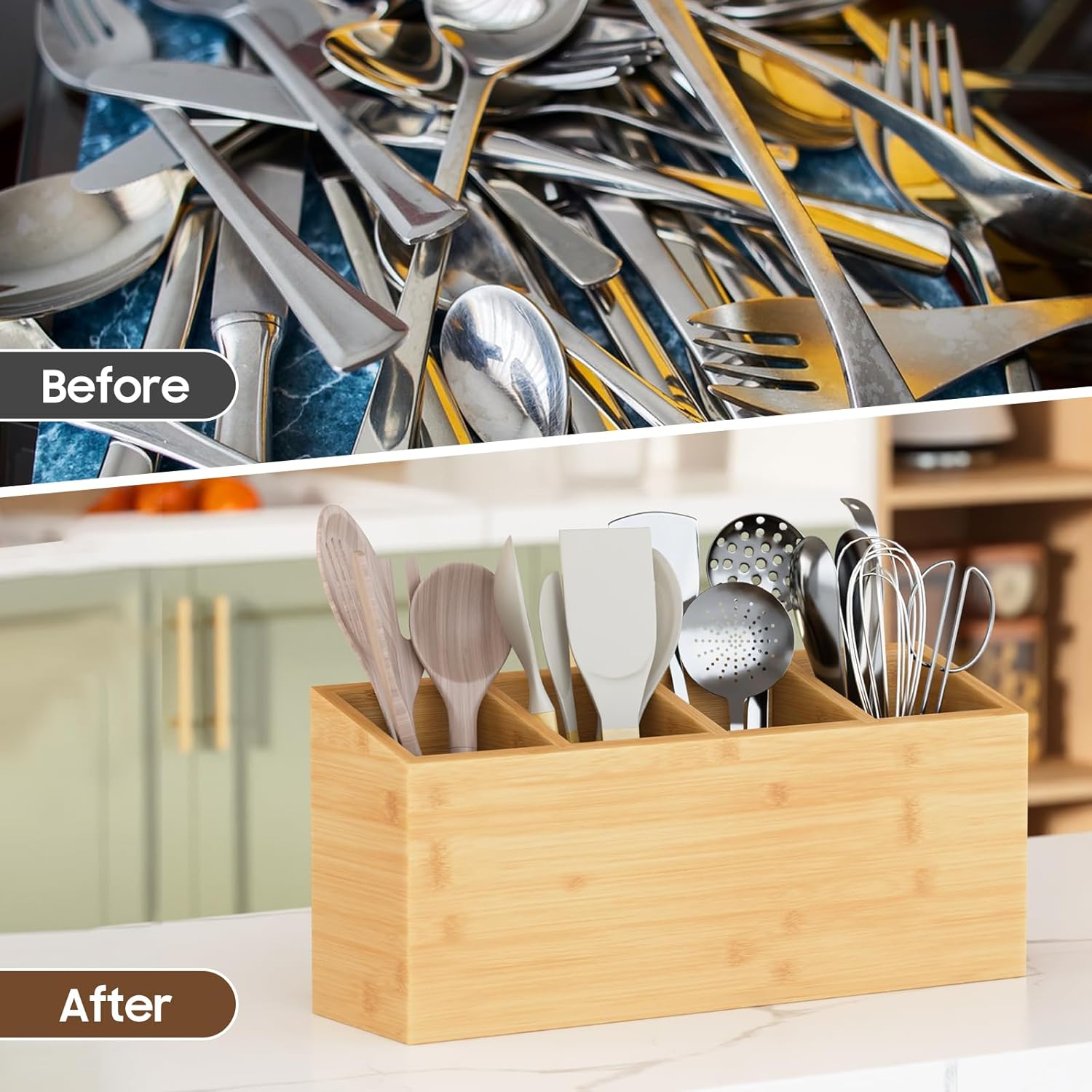 - Our Bamboo utensil organizer has 4 compartments. Large, roomy and pretty. Easy to grab utensils. Size:15.74"L x 5.9"W x 7.08"H. You can store all of your cooking tools easily and neatly. The rectangular shape can fit in nicely against the wall. A nice kitchen decoration!