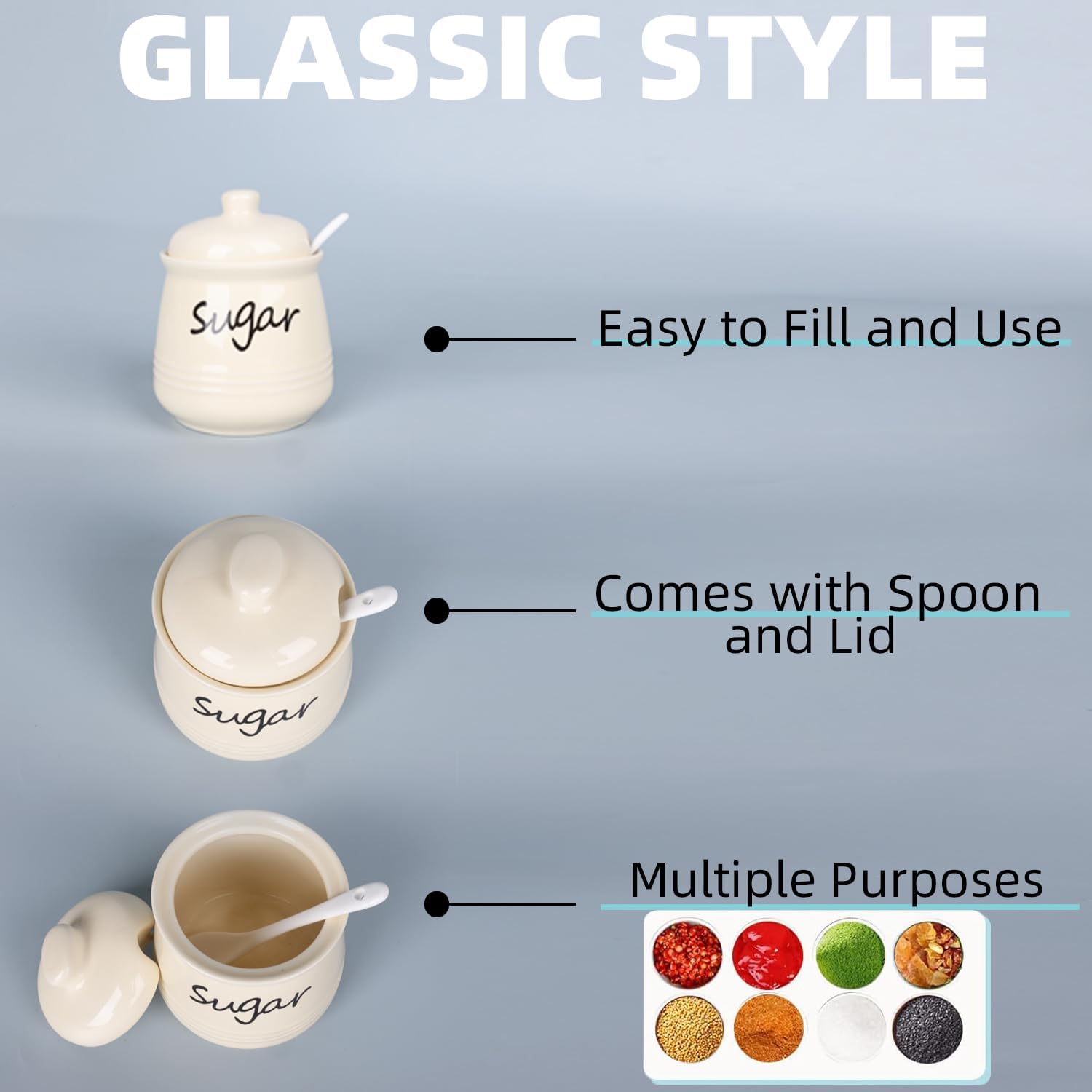 - DESIGN CONCEPT: This sugar bowl is equipped with a lid and a small spoon. The lid can keep your ingredients away from dust. There is a perfect notch on the lid for placing the spoon, so you donβt have to worry about placing the spoon randomly