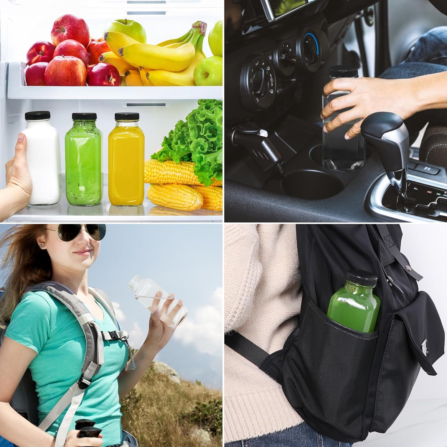 STARSIDE 16 oz Glass Juice Bottles with Lids 3 Pack - Square Reusable Drinking Jars for Juicing, Milk, Kombucha - Includes 1 Bottle Brush, 6 Colored Labels