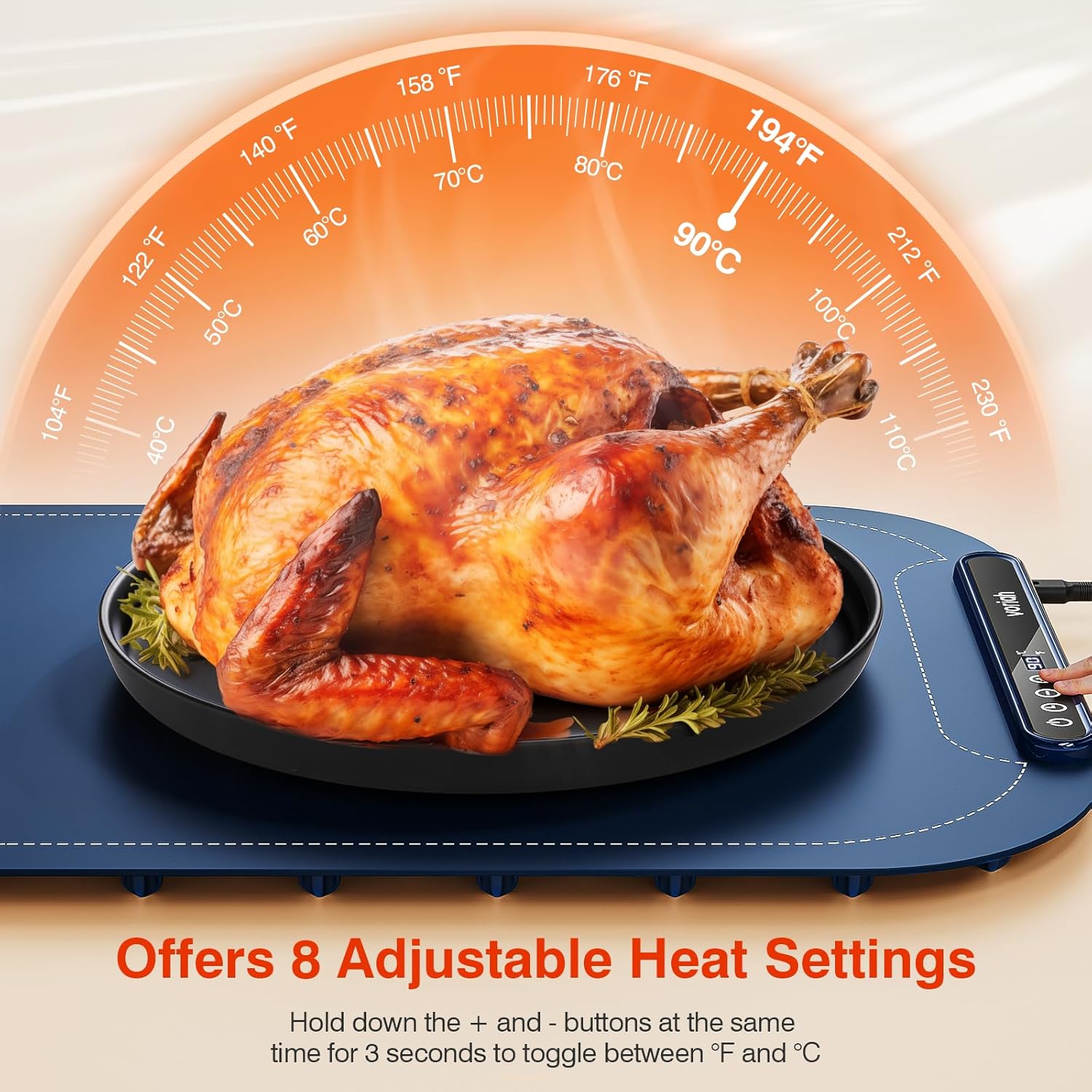 Warming Mat for Food, Voriah Electric Warming Tray with 99H Timer & 8 Temperature Settings, Foldable Food Warmer with °C/°F Switch, Keeps Food Warm at Buffets, Sabbath, Family Gatherings(Dark Blue)