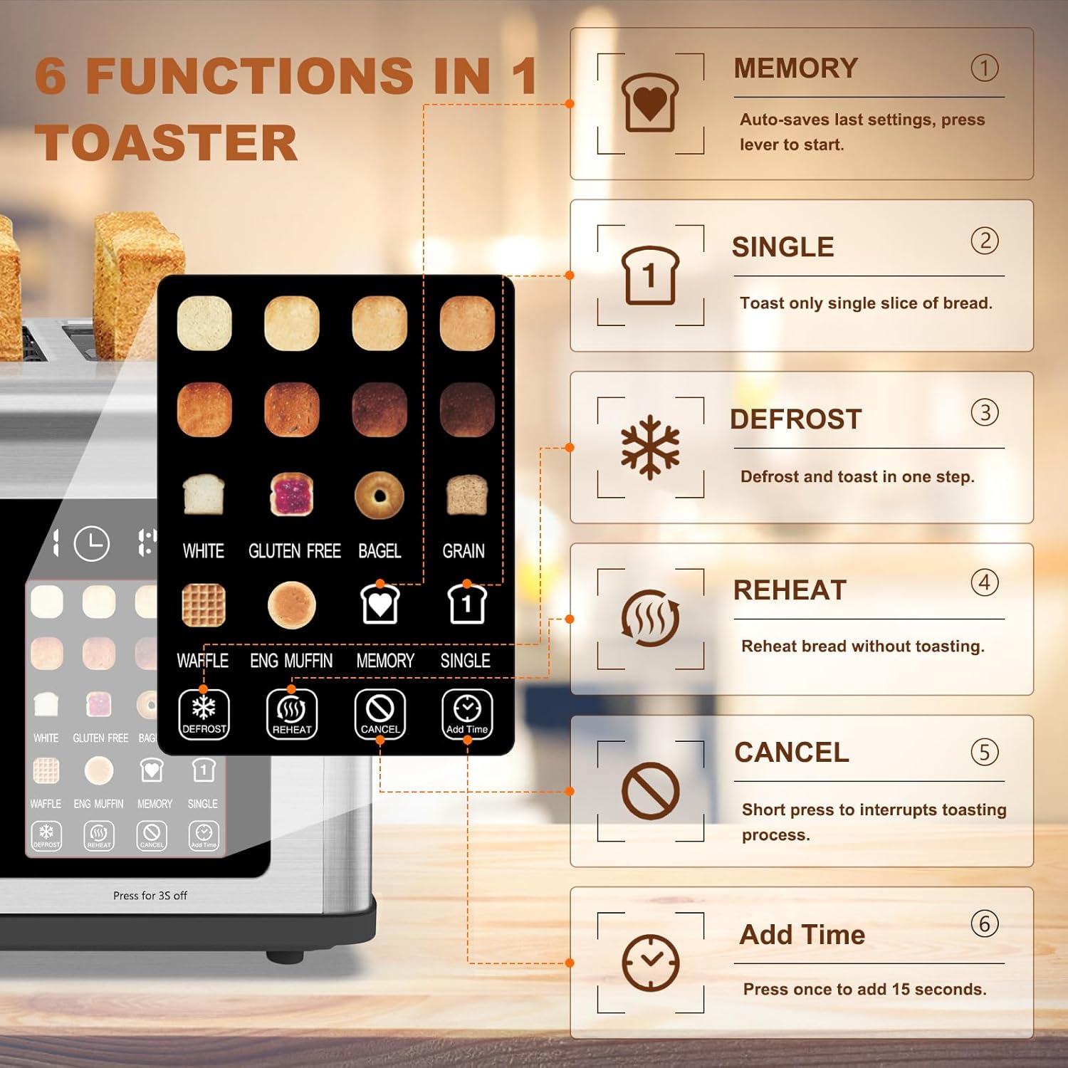 - Peculiar Functions: Except Cancel, Defrost, Reheat functions, we specially added Bread Type, Memory, Sigle slot to toast, Add Time functions. 6 bread type including bagel, white, waffle, eng.muffin, gluten free, grain.