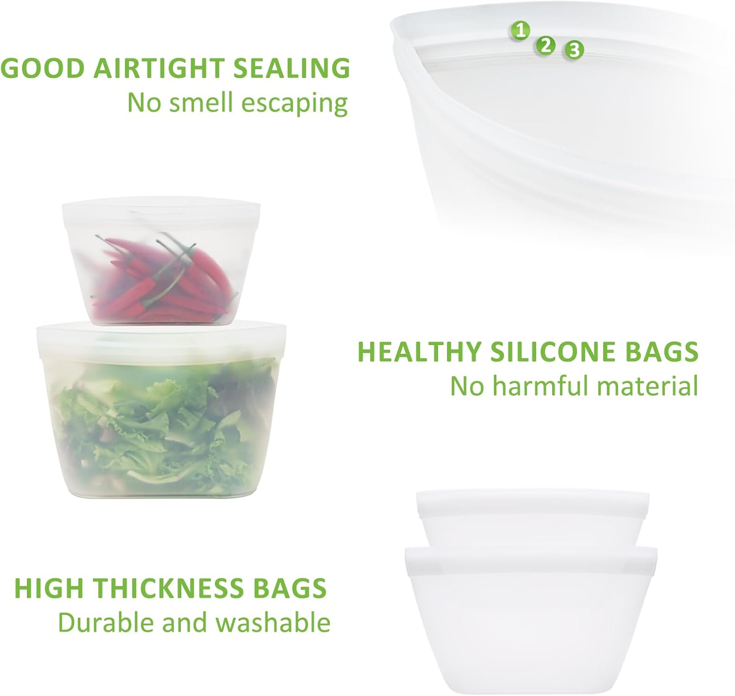 - šššš ššØ šššš, šššš š ššš š šššš: Reusable silicone food storage containers featured with triple zipper closures locks avoid leaking,can shake upside down securely, easier to open and close for anyone. Whether it's in a hurry or for a meal prep, your fruit, sandwich and snack stay perfectly contained, their flavors locked in and your fridge, countertops dry