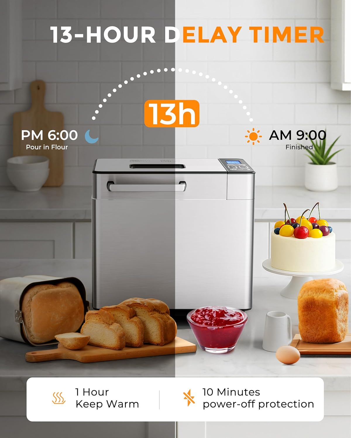 - ๐๐ ๐๐จ๐ฎ๐ซ ๐๐ข๐ฆ๐๐ซ & ๐๐ญ๐ก๐๐ซ๐ฌ ๐๐๐๐๐ฌ๐ฌ๐จ๐ซ๐ข๐๐ฌ: The digital control panel of the Euhomy smart bread maker makes the operation easier and more precise. Our smart bread maker features a 13 hours delay timer, 1 hour keep-warm function, and 15 minutes power outage memory. Wake up to fresh bread or enjoy it warm after work - all with perfect convenience