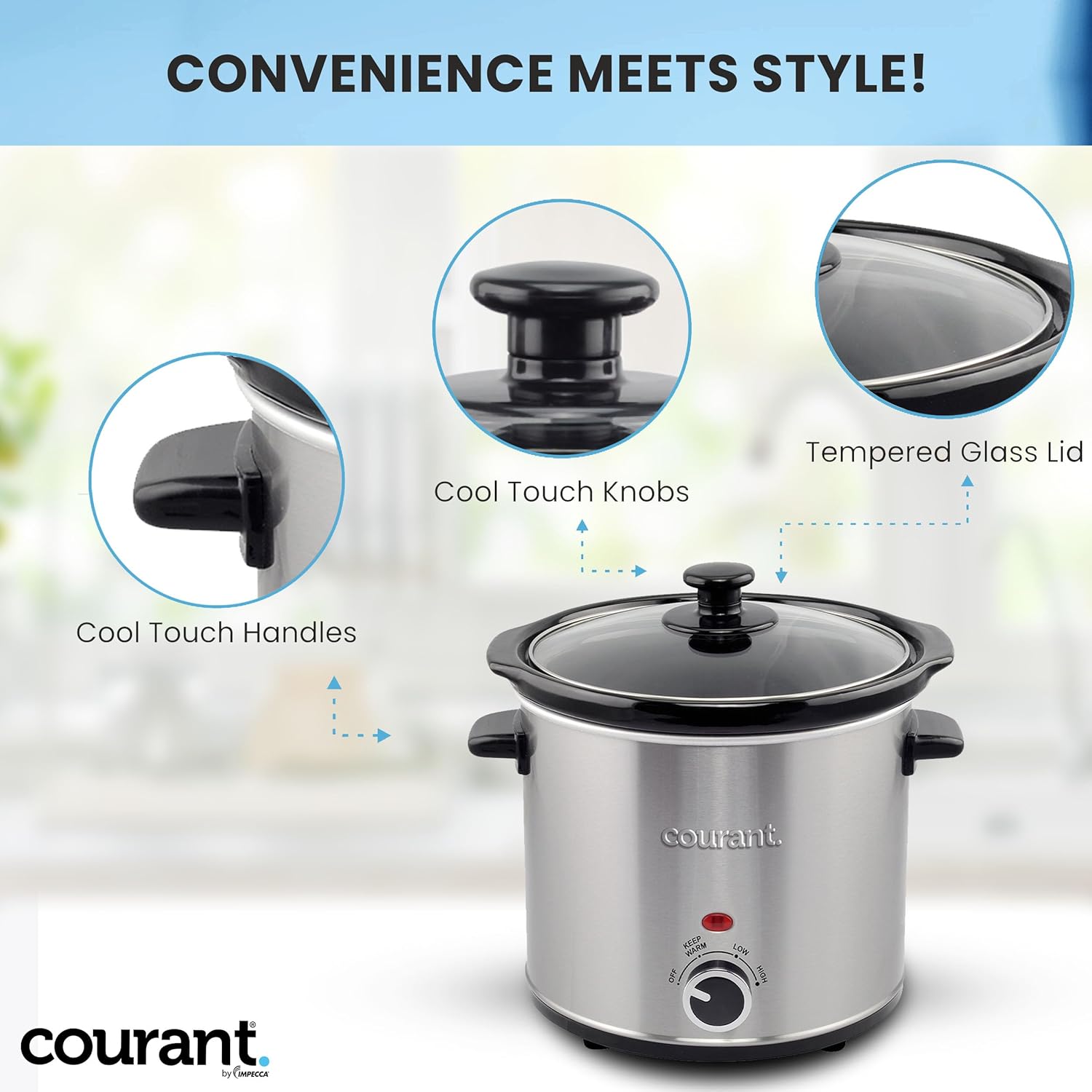Courant Slow Cooker 3.2 Quart - Stainless Steel, Removable Ceramic Insert & Glass Lid With Three Temperature Settings