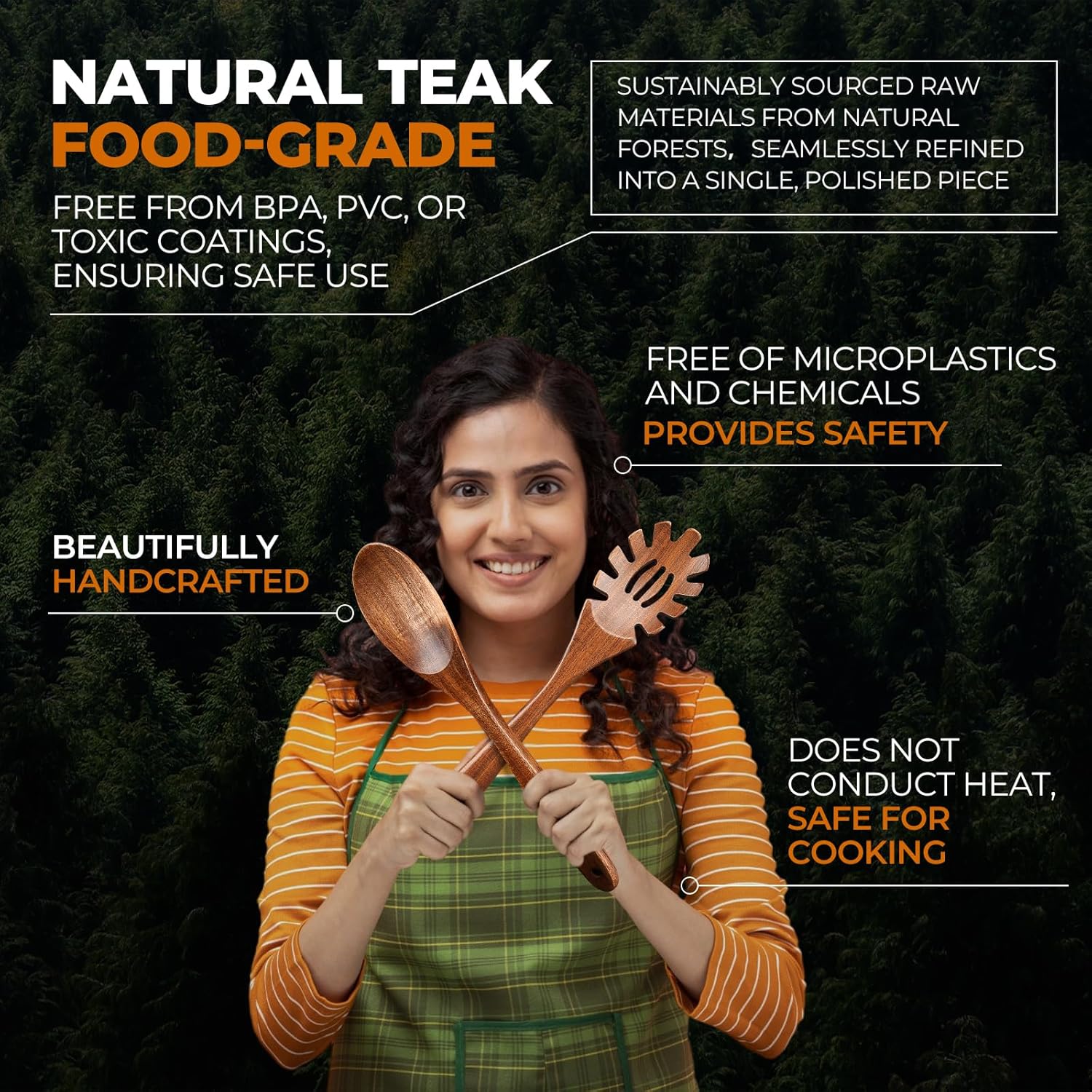 - 100% Natural Material: Each piece is meticulously crafted from a single, solid block of premium Thai teak wood, renowned for its exceptional density and inherent water resistance. We select only the finest teak wood for our Spaghetti Spoon Set, offering a premium material choice