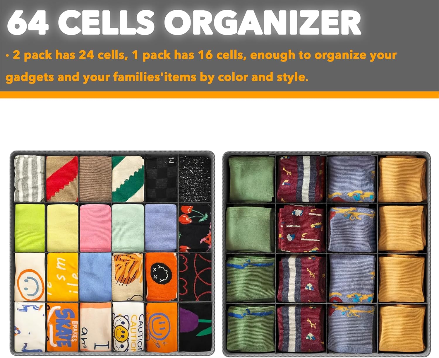 - 64 Cells Underwear Organizer: 2 pack has 24 cells, 1 pack has 16 cells, enough to organize your gadgets and your families'items by color and style, manage your life into a neat organised arrangement.