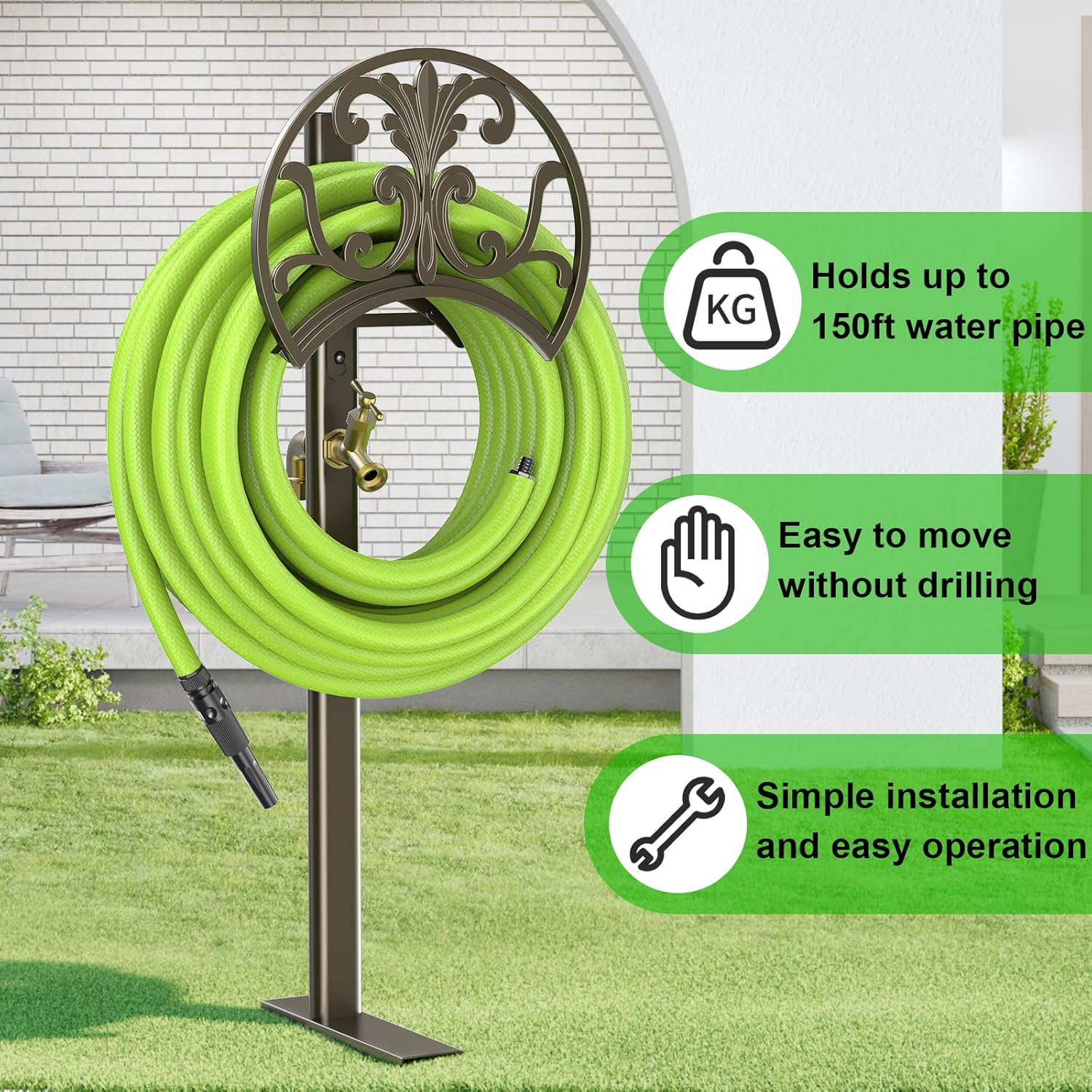 - [Easy Installation]: The hose storage for outside soldered design of the base and the installation without drilling save time and effort. You can stand it against the wall, or use it as a freestanding water hose holder for outside, providing you with the flexibility position to use it.