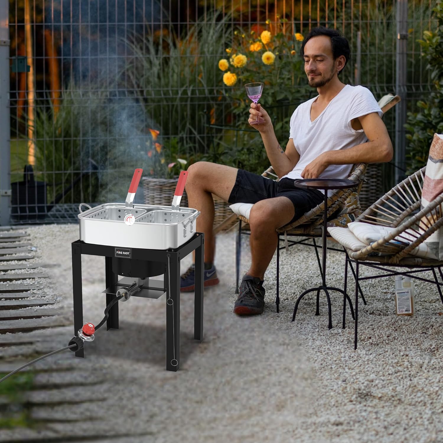 - DUAL BASKETS DESIGN: Easily prepare two dishes at once with our outdoor fryer set, featuring dual strainer baskets for hassle-free cooking. Our double basket deep fryer equipped with heat-resistant silicone handles and an ergonomic grip, it en-sures safety and comfort. Perfect for fish fries, BBQs, camping, or parties, it’s a time-saving solution for both family gatherings and professional chefs!