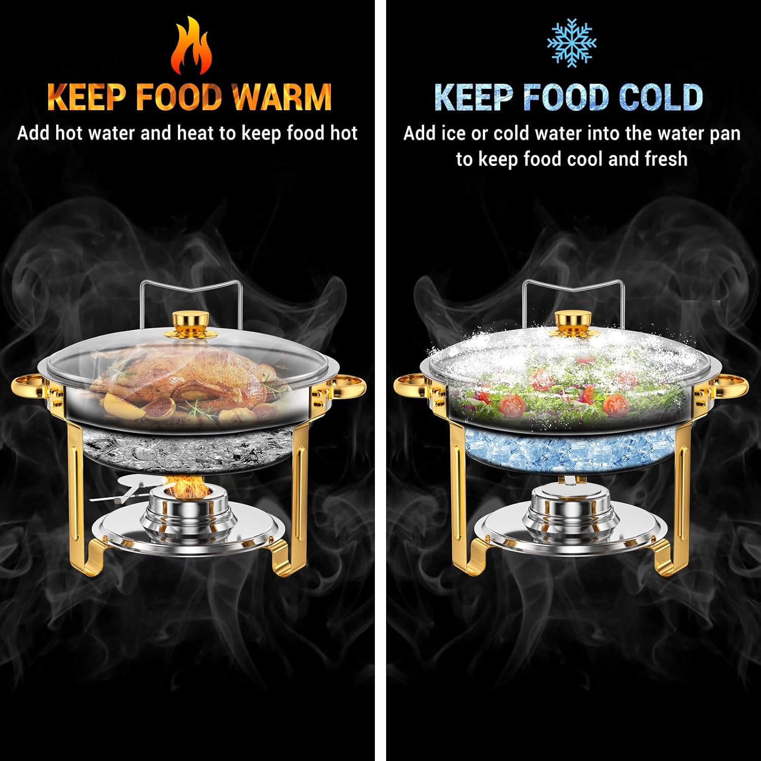 Round Chafing Dishes for Buffet 5 Qt,High Grade Chafing Dish Buffet Set, Full Size Pan,Rolled-Edge Design Food Warmers for Parties,Buffet,Wedding,Birthday,Camping 4 PACK (Half Gold-Glass)