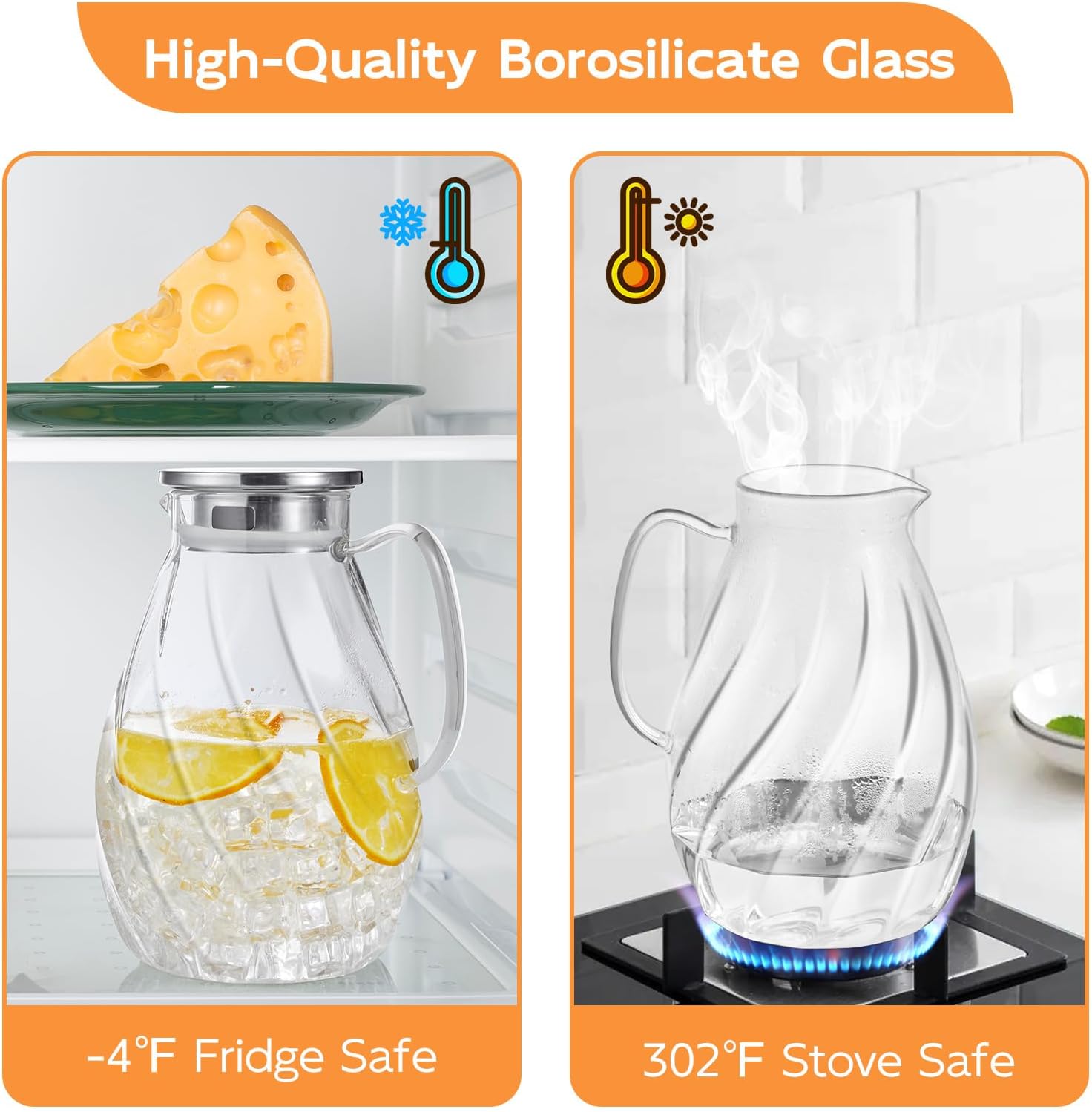 - BOROSILICATE GLASS PITCHER: The tea pitcher is made of borosilicate glass, lead-free, BPA-free, sturdy and lightweight, crystal clear so you can easily display your favorite drink, maintain the original flavor of your beverage better than a plastic drink pitcher, and no need to worry about chemicals