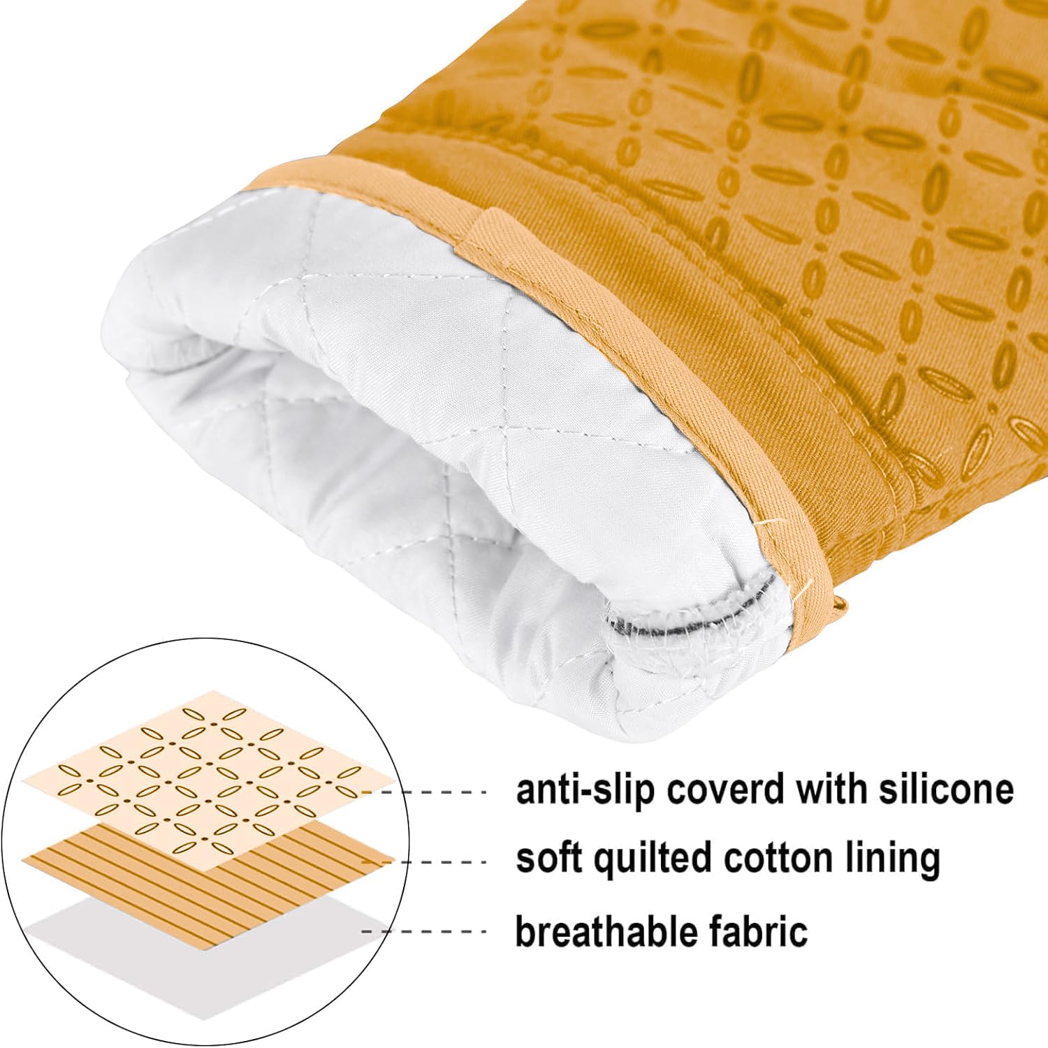 - 500°F HEAT RESISTANT &NON-SLIP: This oven mitts heat resistant 500 degrees because of the durable construction so it can effectively keep you protected from burning while you enjoy cooking and grilling. Enhanced with anti-slip silicone design to provide a more robust, non-slip grip that can be held securely when handling the kitchen utensils