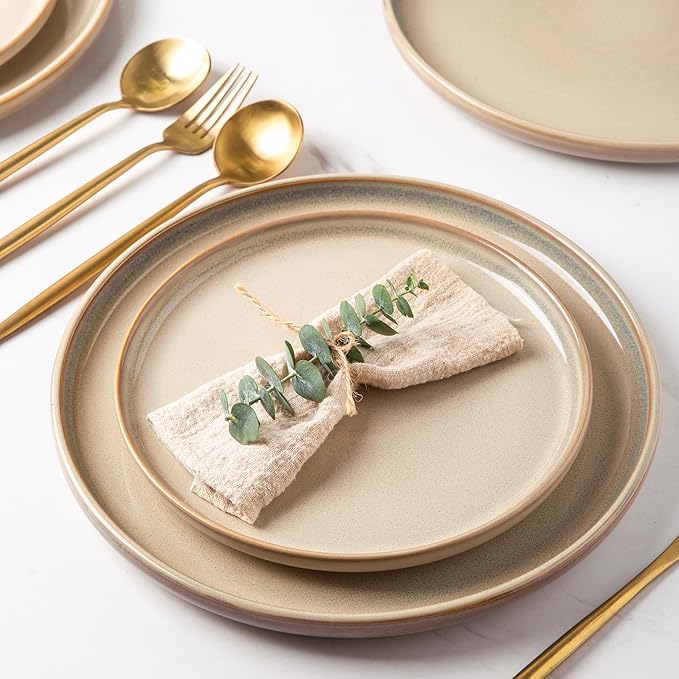 - EVERY PLATE IS UNIQUE: This dinerware set are fired with two different glazes, so the surface develops a beautiful color and makes your food looked even more delicious. The reactive glaze makes every plate unique. Since our glaze is all-natural, it tends to change color depending on the lighting. The color may be a tad different from what you see on your screen, but every item is beautiful.