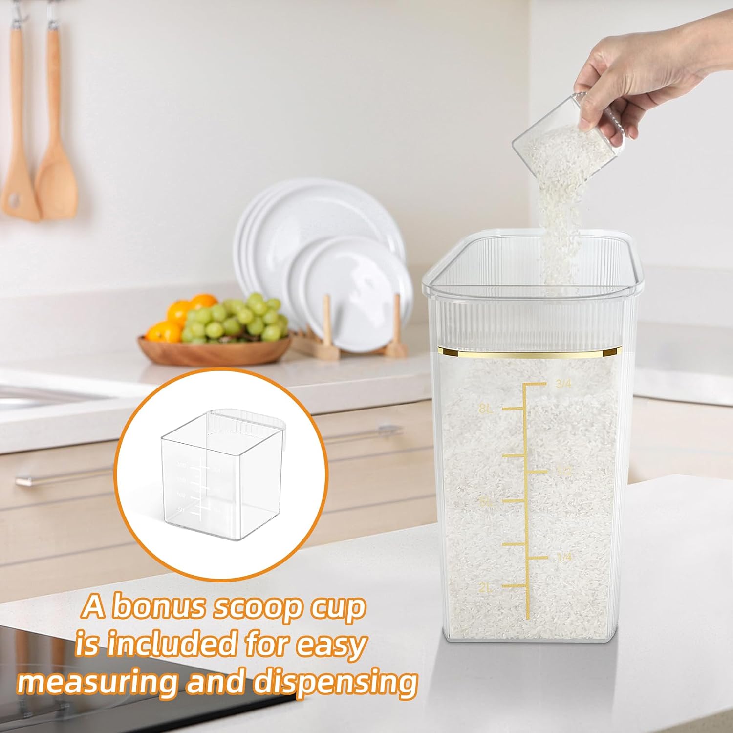 Rice Storage Container 15-20 Lbs, Tall & Narrow Food Storage Container with Measuring Scoop for Dry Goods Rice Flour Pet Food Bath Salt Storage, Clear Plastic Bin with Lid for Pantry Storage