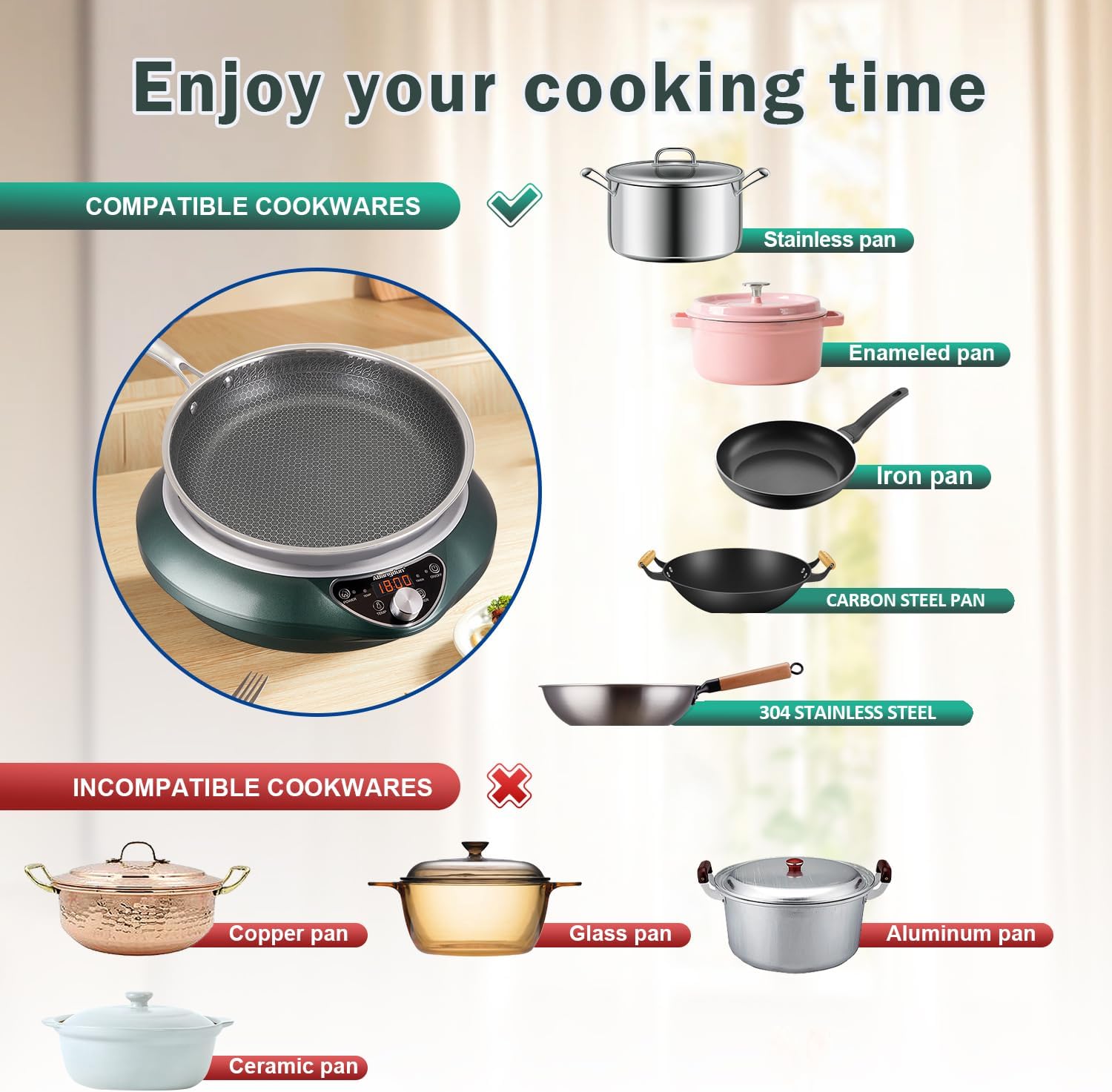 Induction Cooktop with Skillets1800W 120V Burner Cooker Nonstick Flat Pan Electric Stove Hot Plate Heat Evenly Fry Pan for Steak