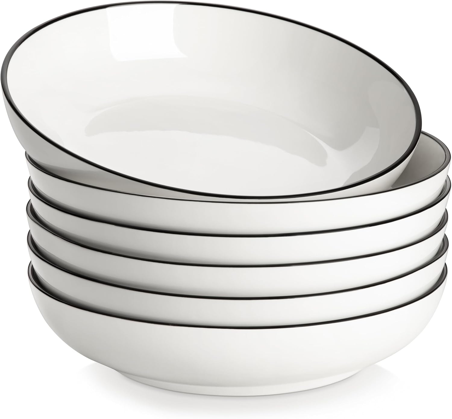 MALACASA 8.85" Large Pasta Bowls, 42 OZ White Salad Bowls Soup Bowls, Porcelain Serving Bowls Set of 6, Ivory White with Black Rim, Microwave & Dishwasher Safe, Series REGULAR