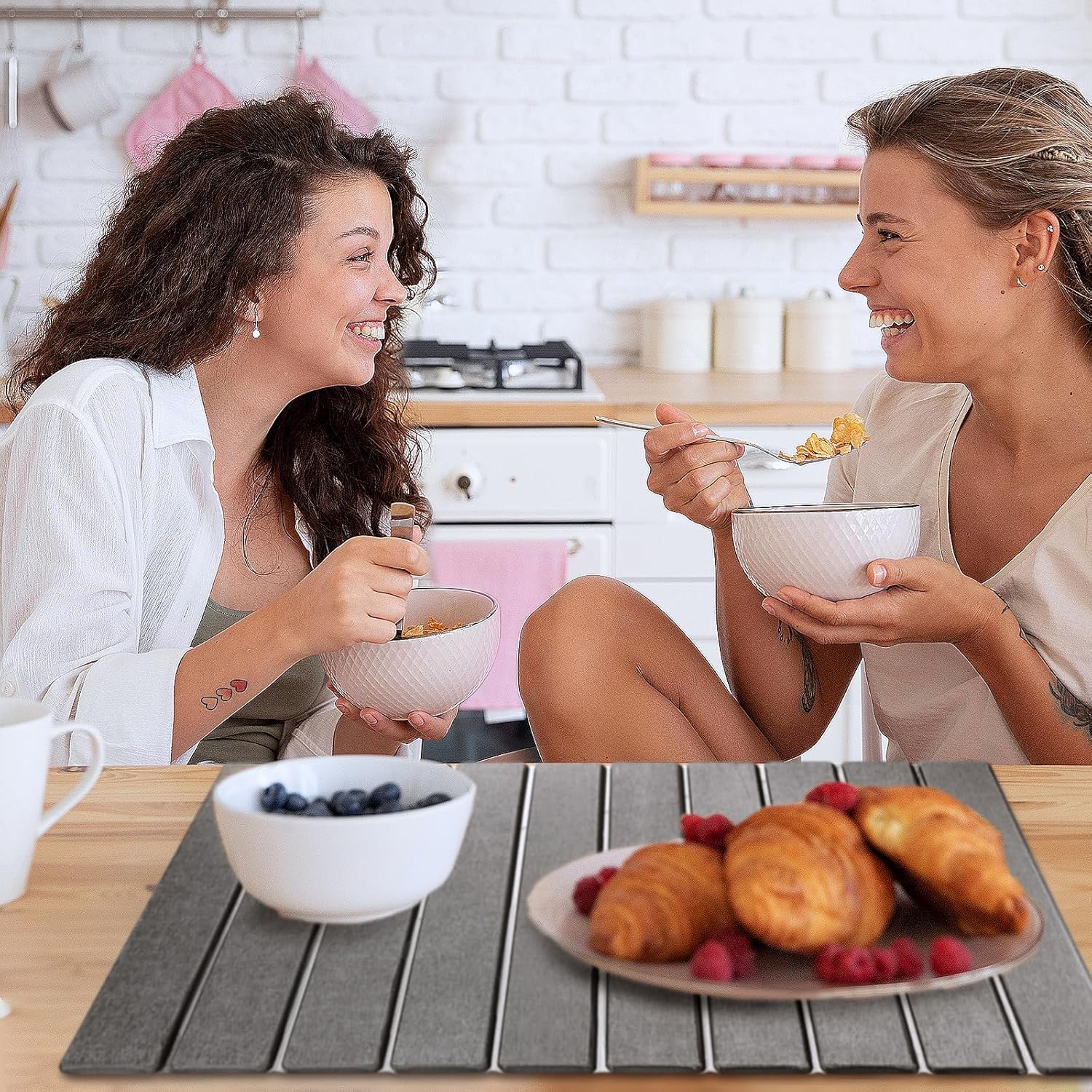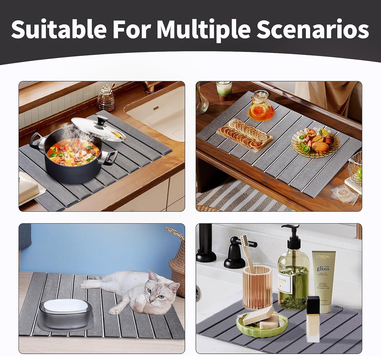 - Versatile Application: Beyond dish drying, the countertop drying mat has wide applications. It can be applied as potholders, or even as protective mats under hot cookware. You can even use it as a pet bowl mat. The quick dry and super absorbent properties make them perfect for absorbing excess water, ensuring your place stay dry