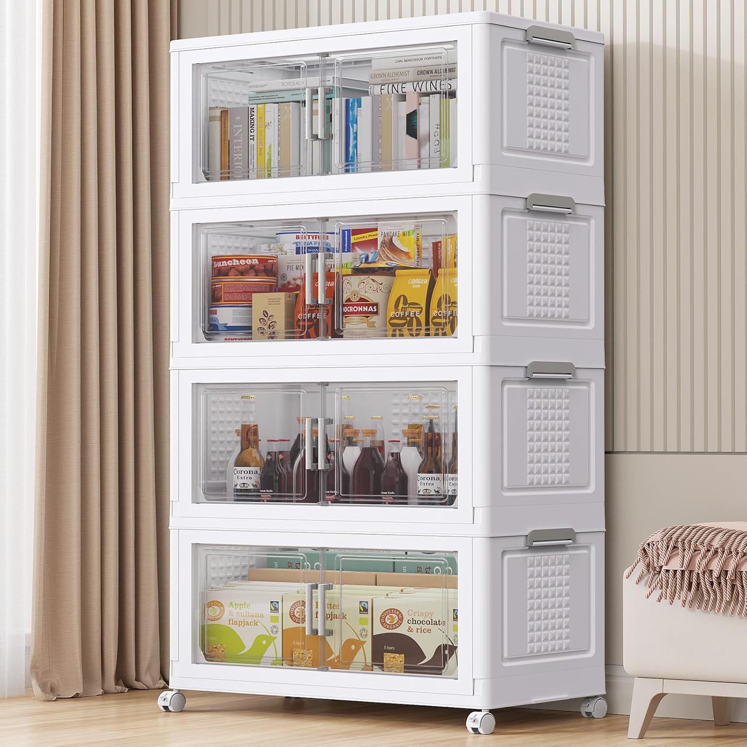55" H 116Gal Plastic Storage Bins with Lid & Wheels,4Pack Large Stackable Storage Bins with Doors,Closet Organizers and Storage Cabinet Shelves Collapsible Box for Home Kitchen,White
