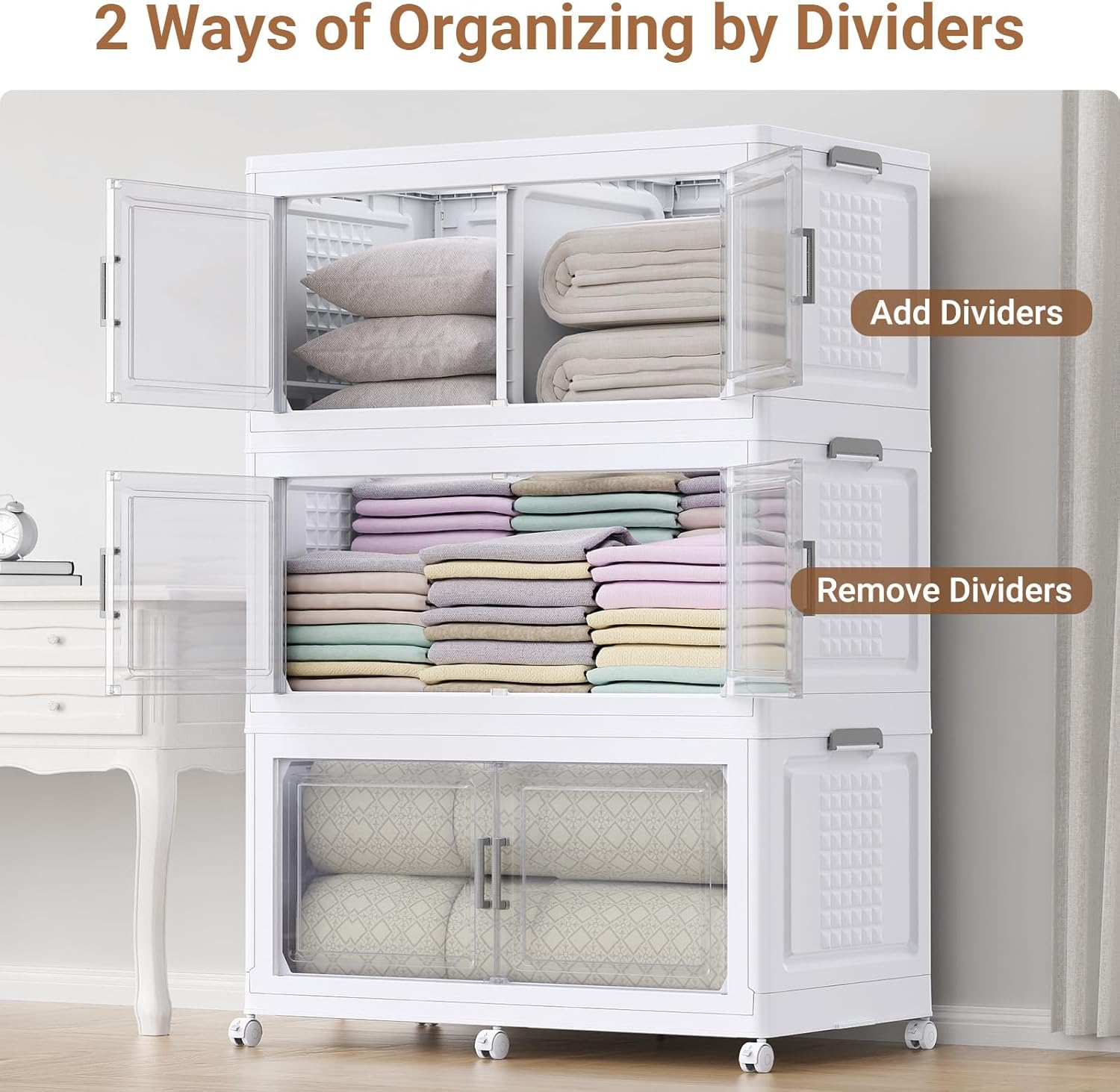 52.7"H 150Gal Plastic Storage Bins with Lid & Wheels,3Pack Extra Large Stackable Storage Bins with Dividers,Closet Organizers and Storage Cabinet Shelves Collapsible Box for Home Kitchen,White
