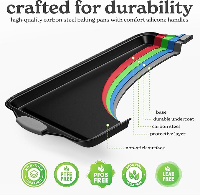 - Silicone Handles: Our bakeware sets non toxic are designed with safety in mind. The silicone handles ensure a secure grip, allowing you to easily and safely move your nonstick baking sheets in and out of the oven.