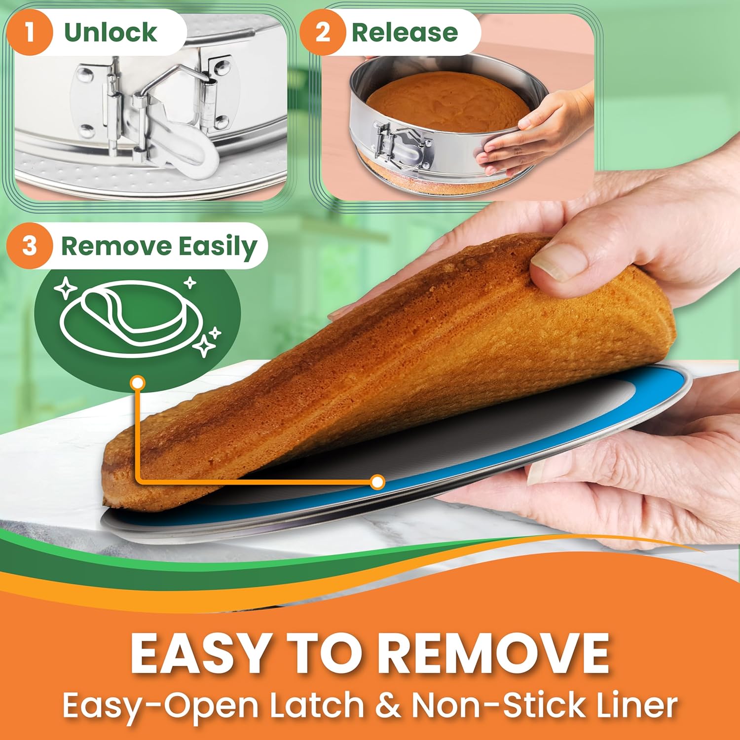 - EASY CAKE REMOVAL – The food-grade silicone liner provides a smooth, reusable non-stick surface, ELIMINATING THE NEED FOR PARCHMENT PAPER or sprays. UNLOCK THE LATCH, and your cake will release easily, perfectly round, and flawless—thanks to the 9 in spring form pan for cheesecake design!