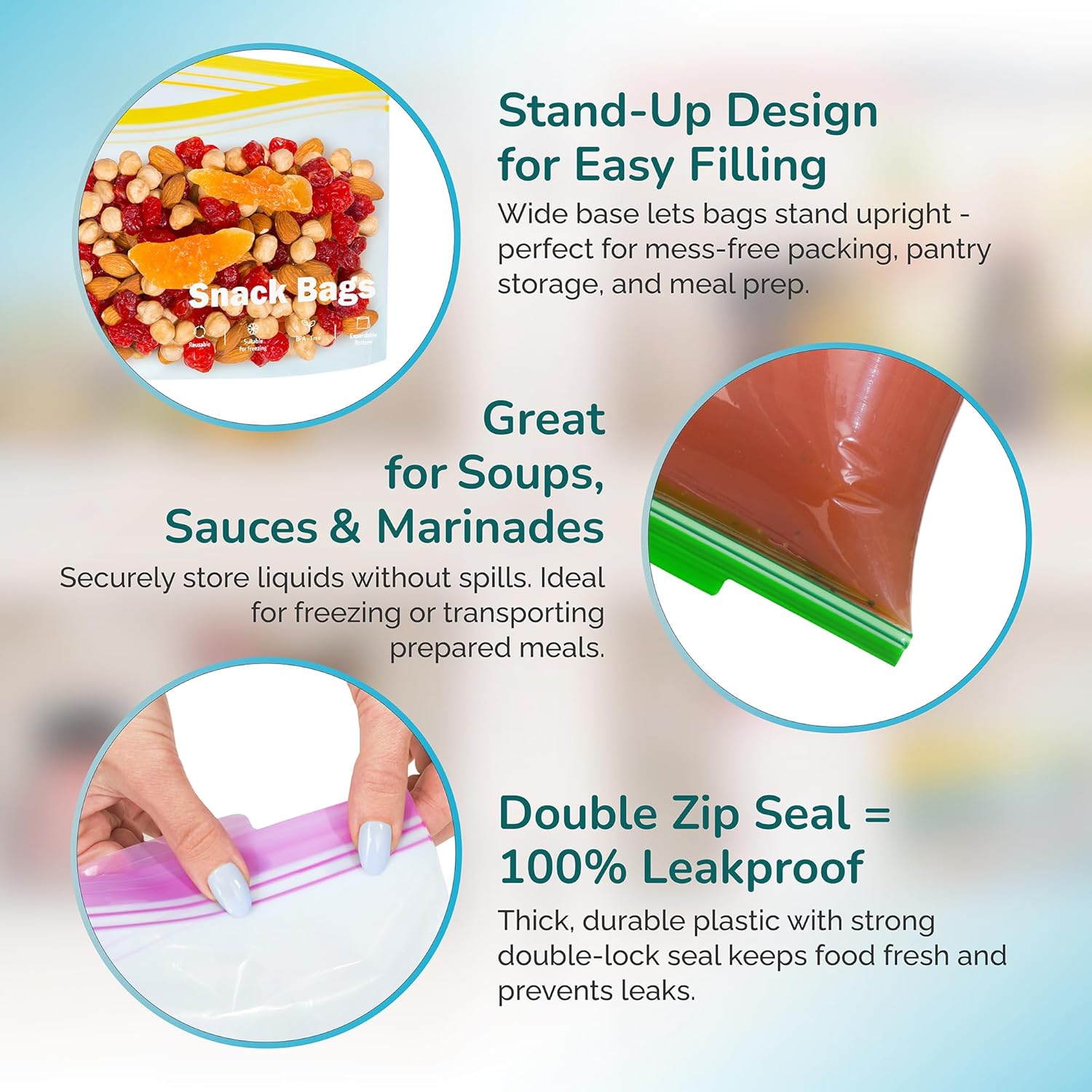 - πΉ Stand Tall & Seal Tight β No Leaks, No Mess. Each bag stands upright with a wide, expandable base β making filling and storing easier than ever. Dual zipper locks snap shut to keep food fresh and liquids secure
