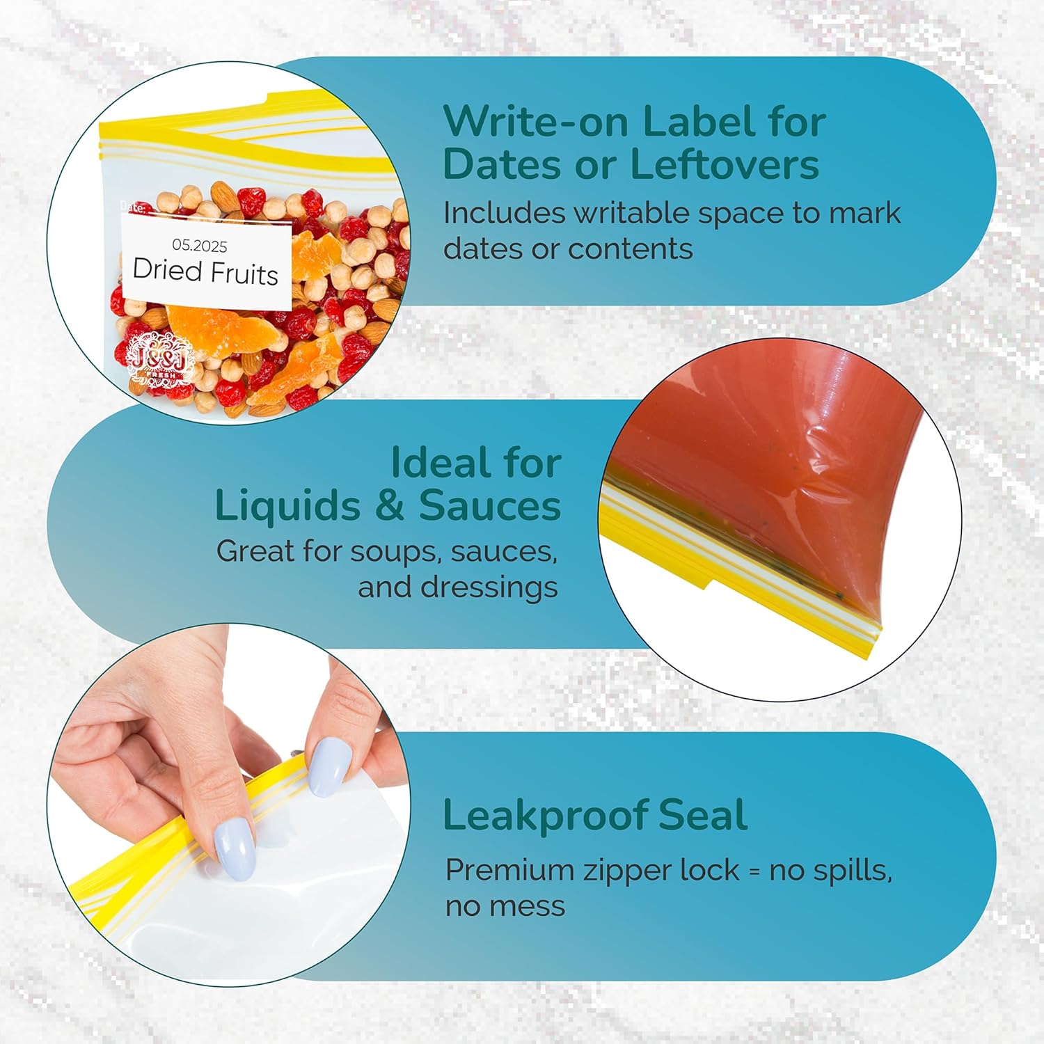 J&&J Fresh Storage Snack Bags, 50 Pack ā Reusable Snack Bags, BPA-Free, Leakproof ā Expandable Bottom, Microwave-Safe, Strong Zipper Lock Seal ā Snack Bag for Freezer & Fridge ā Durable & Washable