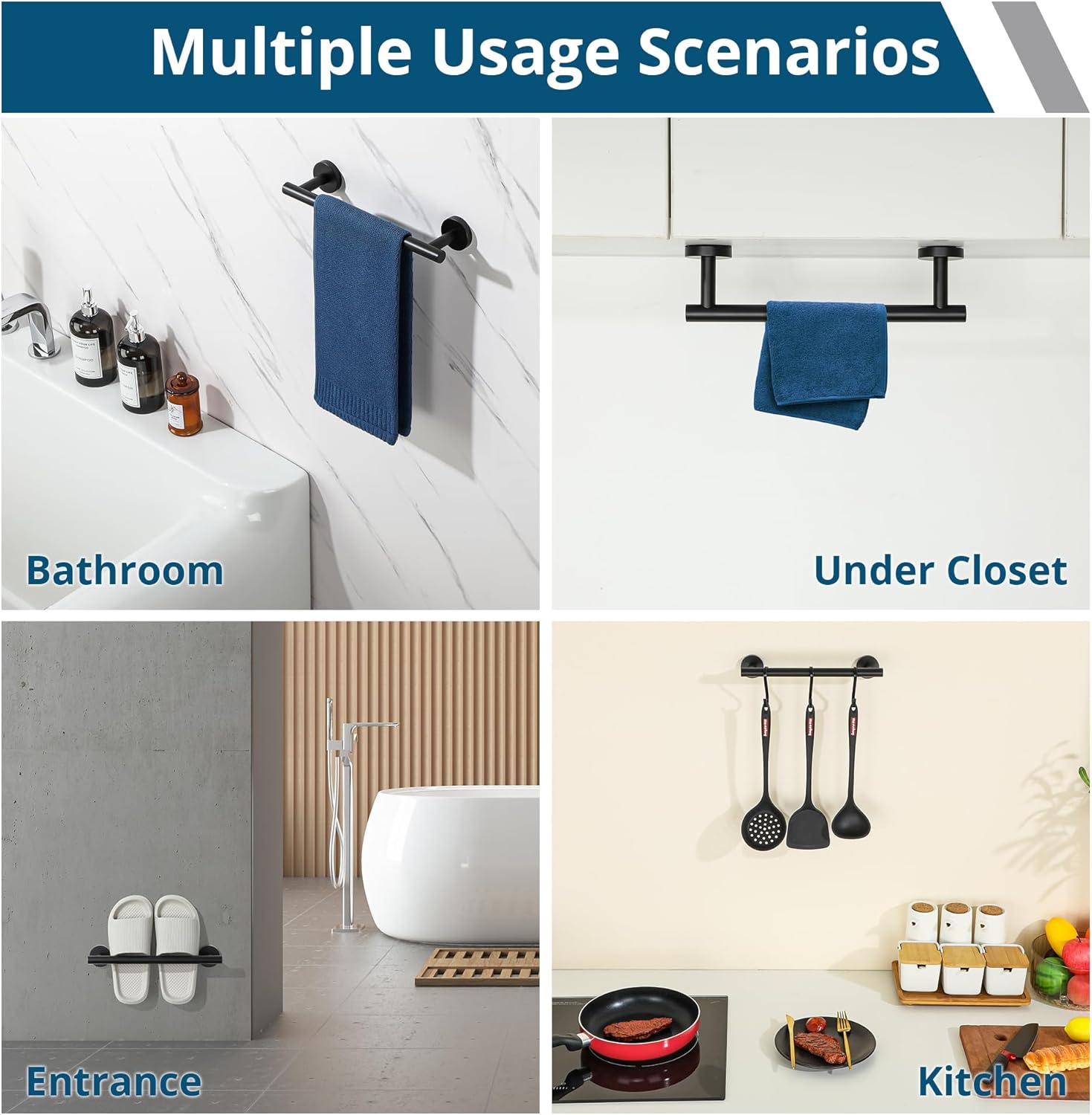 - 12 INCH TOWEL BAR -The overall length of the bathroom towel rack is 11.82" & the length of hanging space is 9.14" . You can mount this towel bar for bathroom to either side of your cabinet or closet door for storing at-use hand and dish towels.