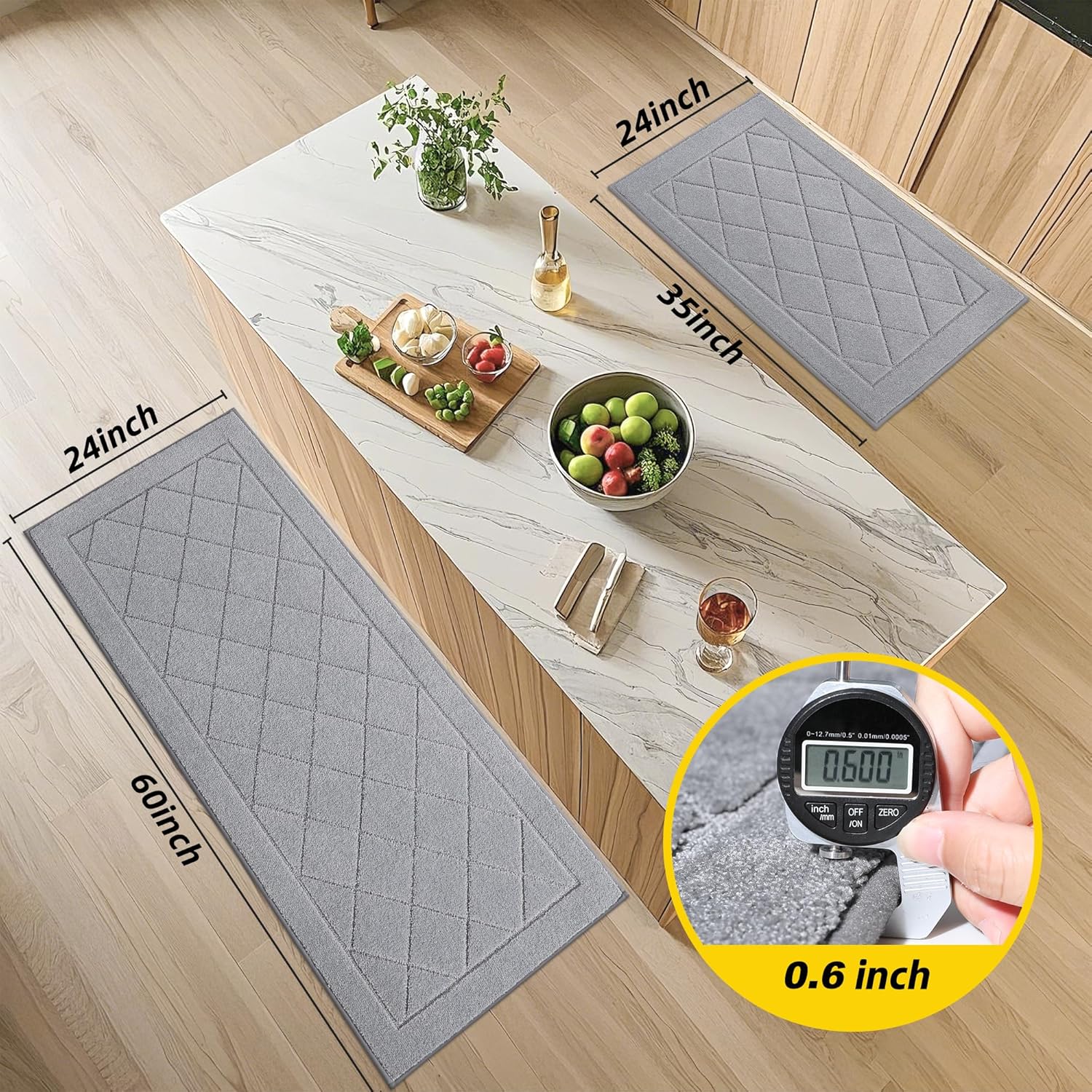 JSEI Non-Slip Kitchen Rugs, Self Adhesive No Sliding Kitchen Mats Set of 2, Soft Washable Absorbent Floor Mat for Kitchen, Bathroom, Laundry Room, Bedroom, 24”x36”+24”x60”, Light Grey, Diamond Pattern