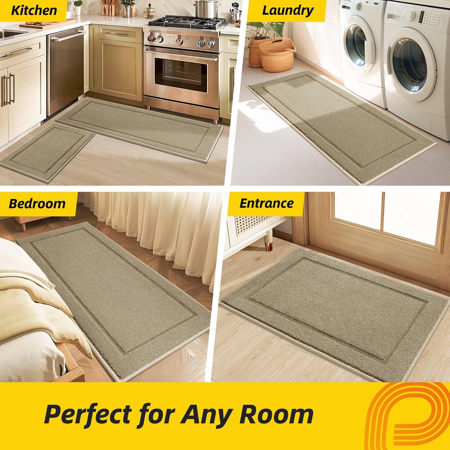 JSEI Non-Slip Kitchen Mats, Self Adhesive No Sliding Kitchen Rugs Set of 2, Washable Absorbent Floor Mat for Kitchen, Bathroom, Laundry Room, Bedroom, 20”x32”+20”x48”, Beige, Rectangular Pattern
