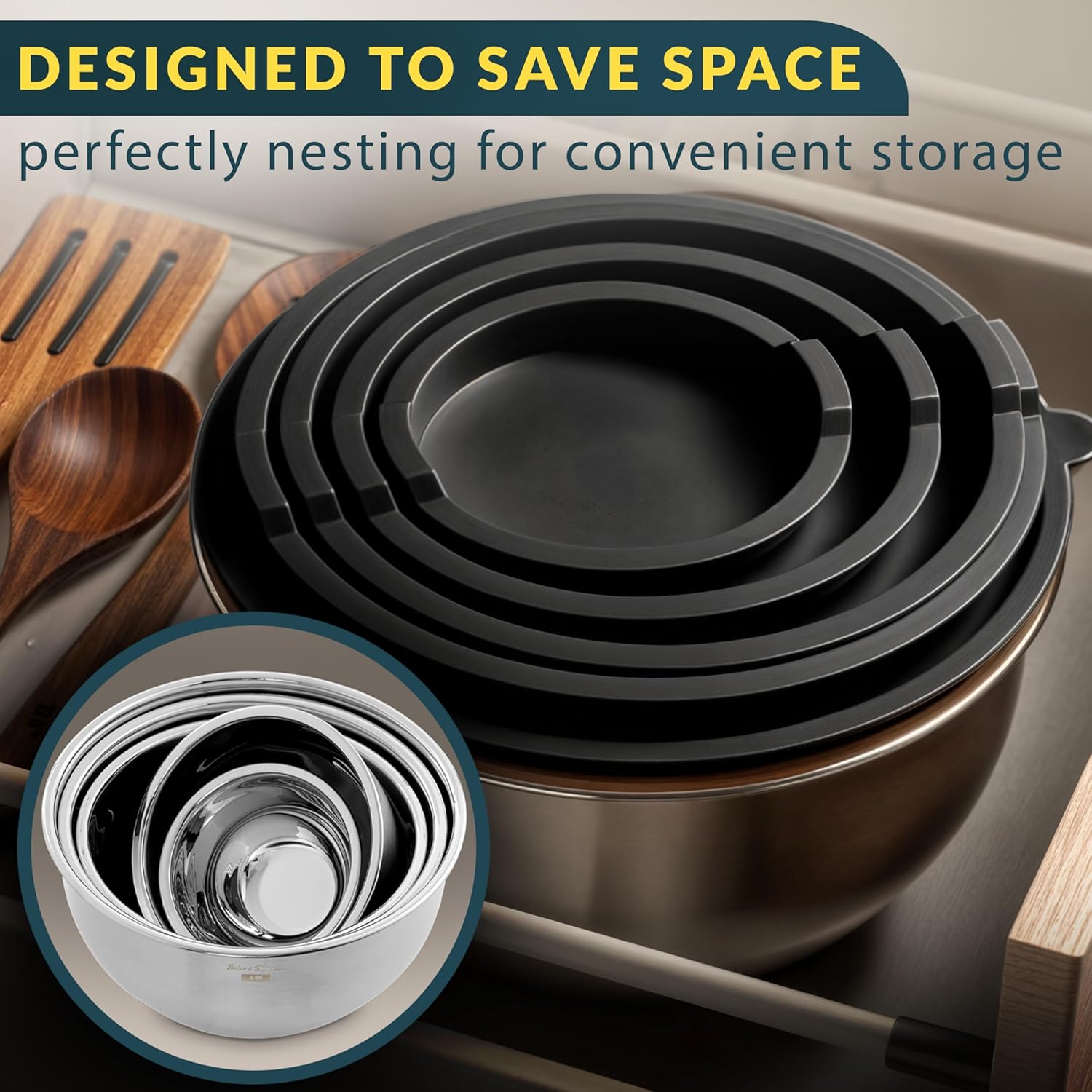 - SMART NESTING SAVES SPACE: These silver mixing bowl stack neatly into one another for efficient storage. Each stainless steel mixing bowl lid set is BPA-free and helps keep food fresh longer in your fridge.
