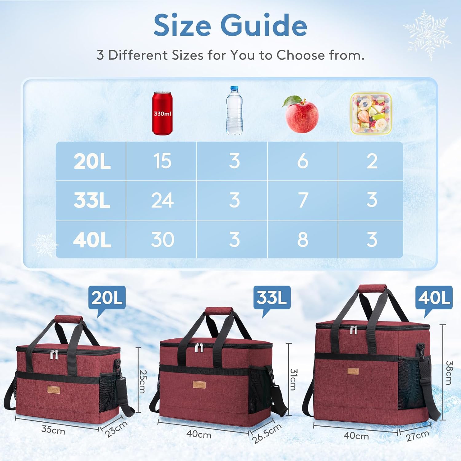 - Measurements: The cooler bag can hold up to 20 Liters (5.3 gallons) by volume; The overall dimensions of the lunch bag are 13.7"(35cm) × 9"(23cm) × 9.8"(25cm)