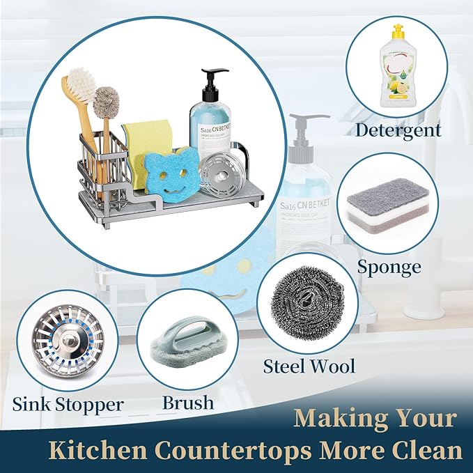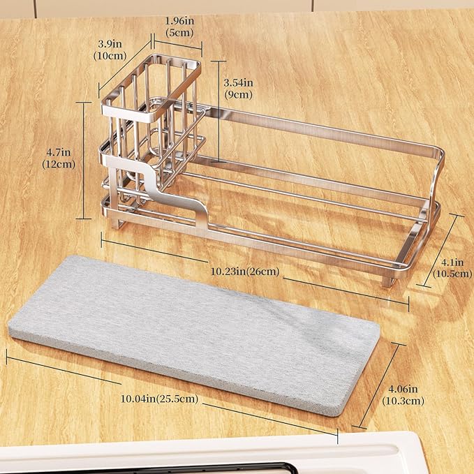 - [Fast Water Absorption and Drying]: Equipped with a sink caddy sponge holder featuring a diatomite base, it quickly absorbs water and dries fast, preventing water spots and odors, while keeping your items dry