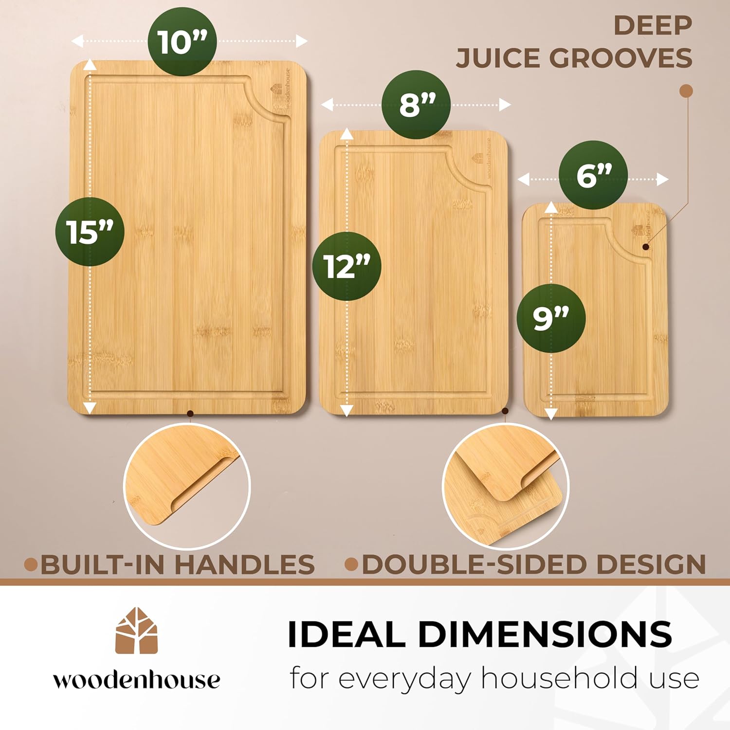 Bamboo Cutting Board Set of 3 - Thick & Durable Wood Cutting Boards with Deep Juice Grooves & Build-in Handles, Large Surface, Easy to Clean – for Meat, Vegetables and Fruits