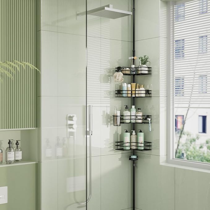 - [4-tier Shelving & Save Space]: HapiRm corner shower caddy fits snugly in the corner of your bathroom and features a 4-tier shelf design to store all your toiletries in one place