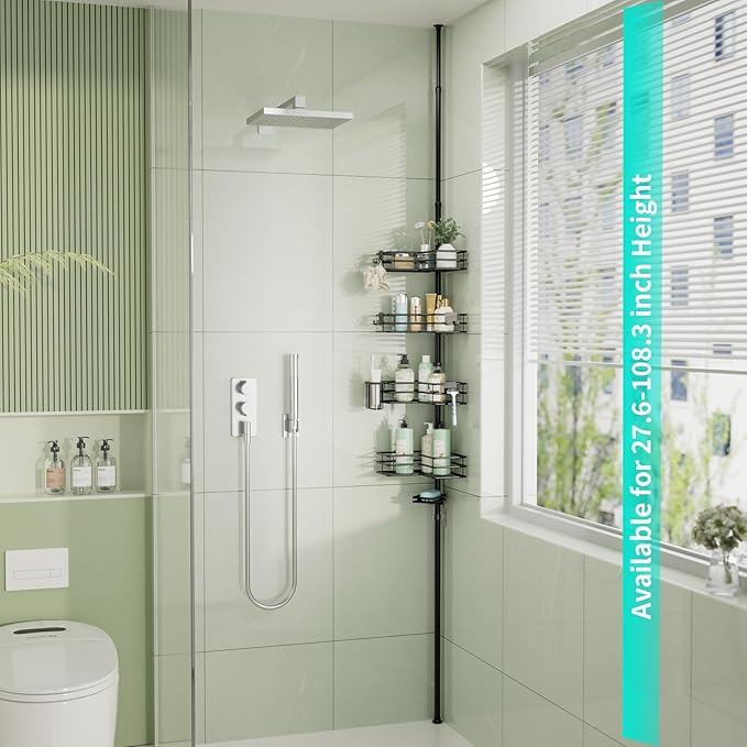 - [Adjustable Height Shower Organizer]: Our shower caddy tension pole features a unique spring design that can be adjusted to fit spaces between 27.6-108.3 inches, you can customize the length as needed