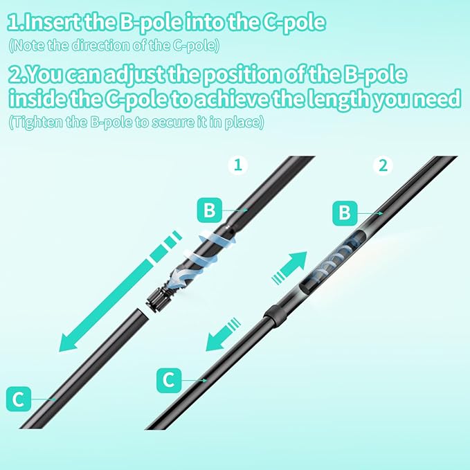 - [Warm Tips]: Insert the B-pole into the C-pole, you can adjust the position of the B-pole within the C-pole to achieve the desired length. The C-pole has threads on the inside, once you have chosen the position, simply tighten the B-pole to secure it