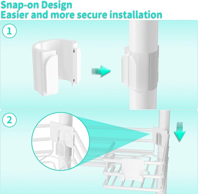 - [Convenient Snap-on Design]: Our shower caddy features a snap-on design that makes installation quick and easy, and also makes the shower corner shelf more firm. Allows you to adjust the height between shelves more conveniently