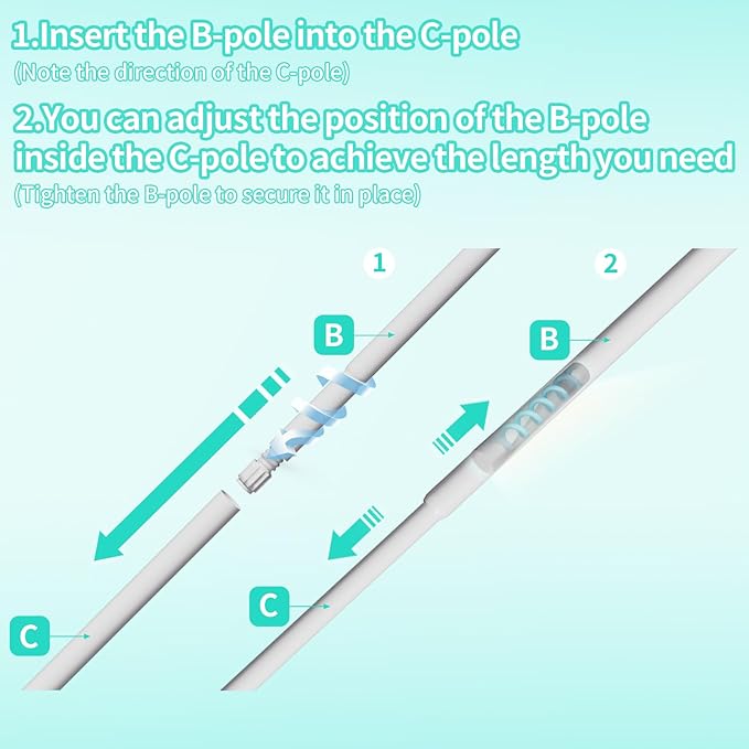 - [Warm Tips]: Insert the B-pole into the C-pole, you can adjust the position of the B-pole within the C-pole to achieve the desired length. The C-pole has threads on the inside, once you have chosen the position, simply tighten the B-pole to secure it