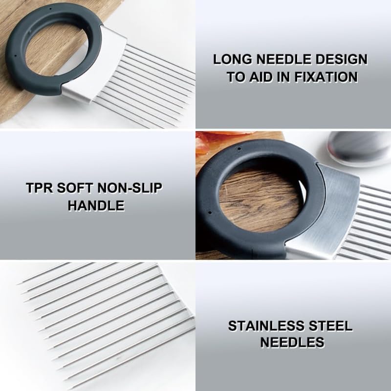 - Onion Slicer: This slicer features 10 stainless steel forks to hold onions in place, making slicing quick and easy. It includes a comfortable grip and non-slip design for added convenience.