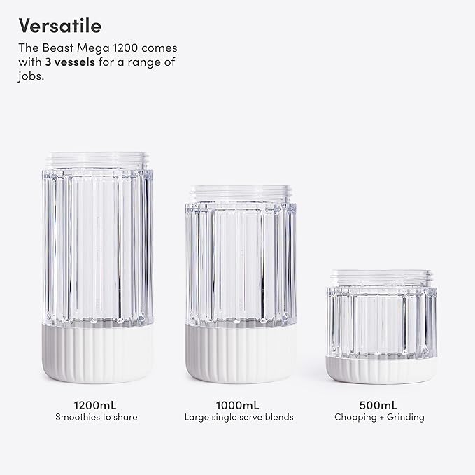 - WHAT'S INCLUDED: 1200W Motor Blender Base, Beast Mega Blade, 3x Blending Vessels (1200mL, 1000mL, and 500mL), 2x Storage Lids, Drinking Lid, Carry Cap, Straw Cap, 2x Straws. Designed for 120V use only.