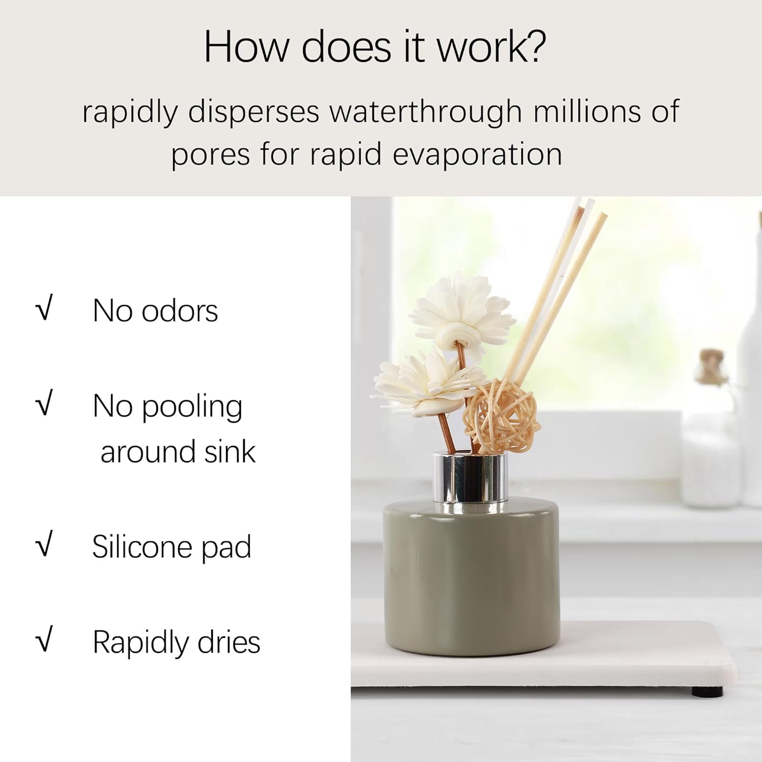 - Made from natural Diatom mud and plant fiber, small holes within diatomite enable it have amazing water absorption. They could absorb water and gets dry in a few minutes. It makes the Bathroom Counter top more dry and tidy.